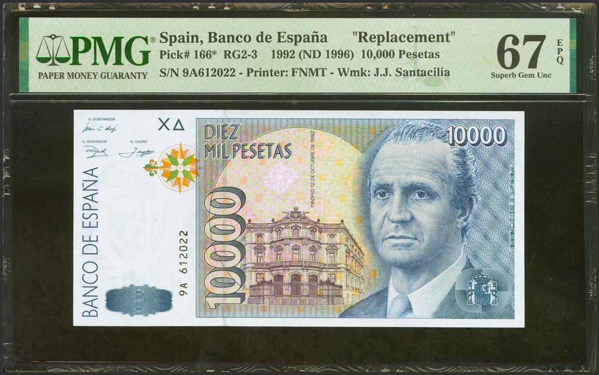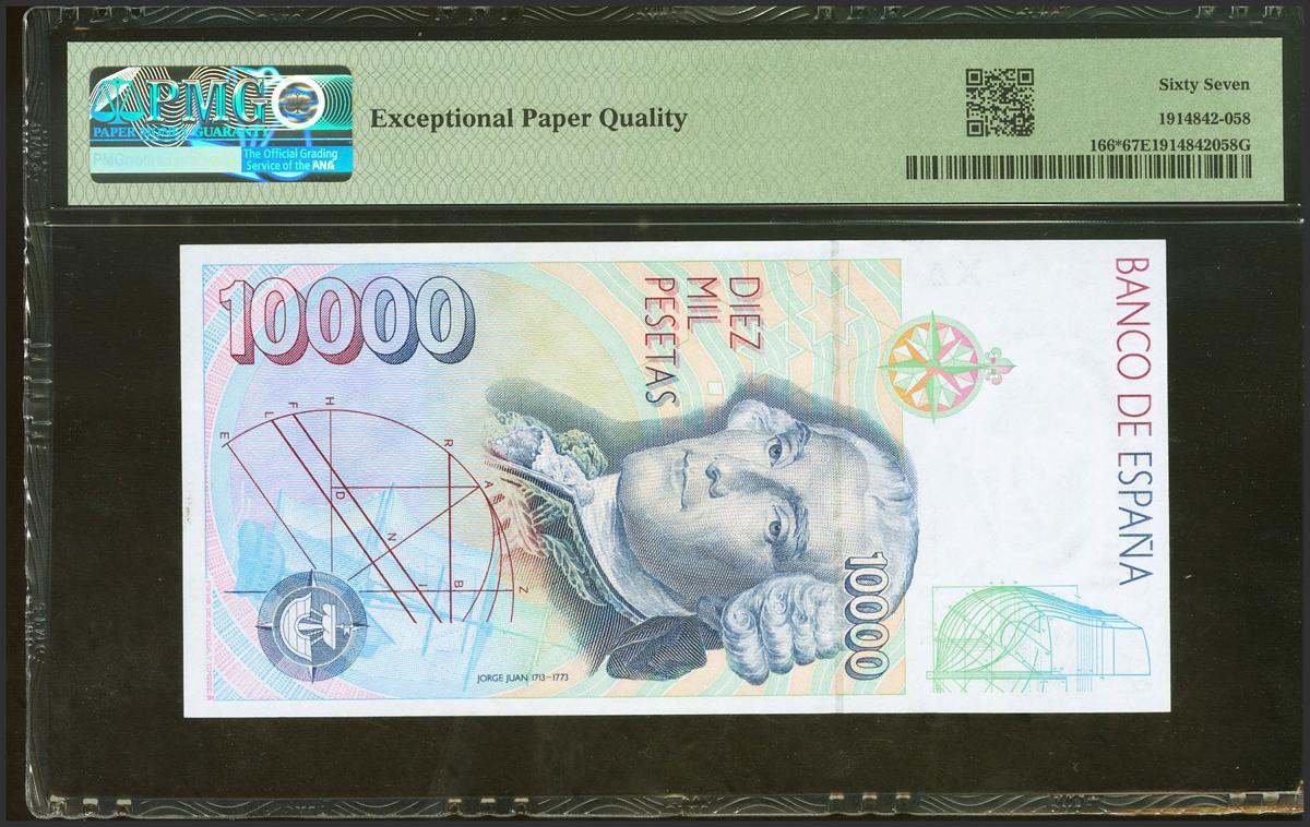 10000 Pesetas. 12 de Octubre de 1992. Serie especial 9A. (Edifil 2021: 485b, Pick: 166*). Raro en esta excepcional calidad. SC. Encapsulado PMG67EPQ.