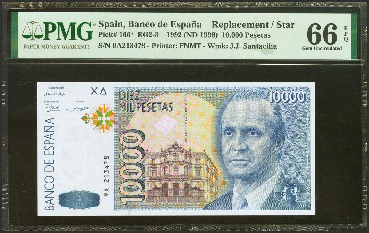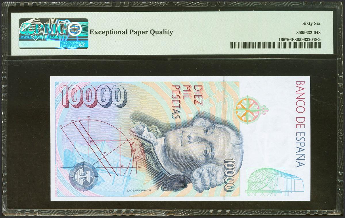 10000 Pesetas. 12 de Octubre de 1992. Serie especial 9A. (Edifil 2021: 485b, Pick: 166*). Raro en esta excepcional calidad. SC. Encapsulado PMG66EPQ.
