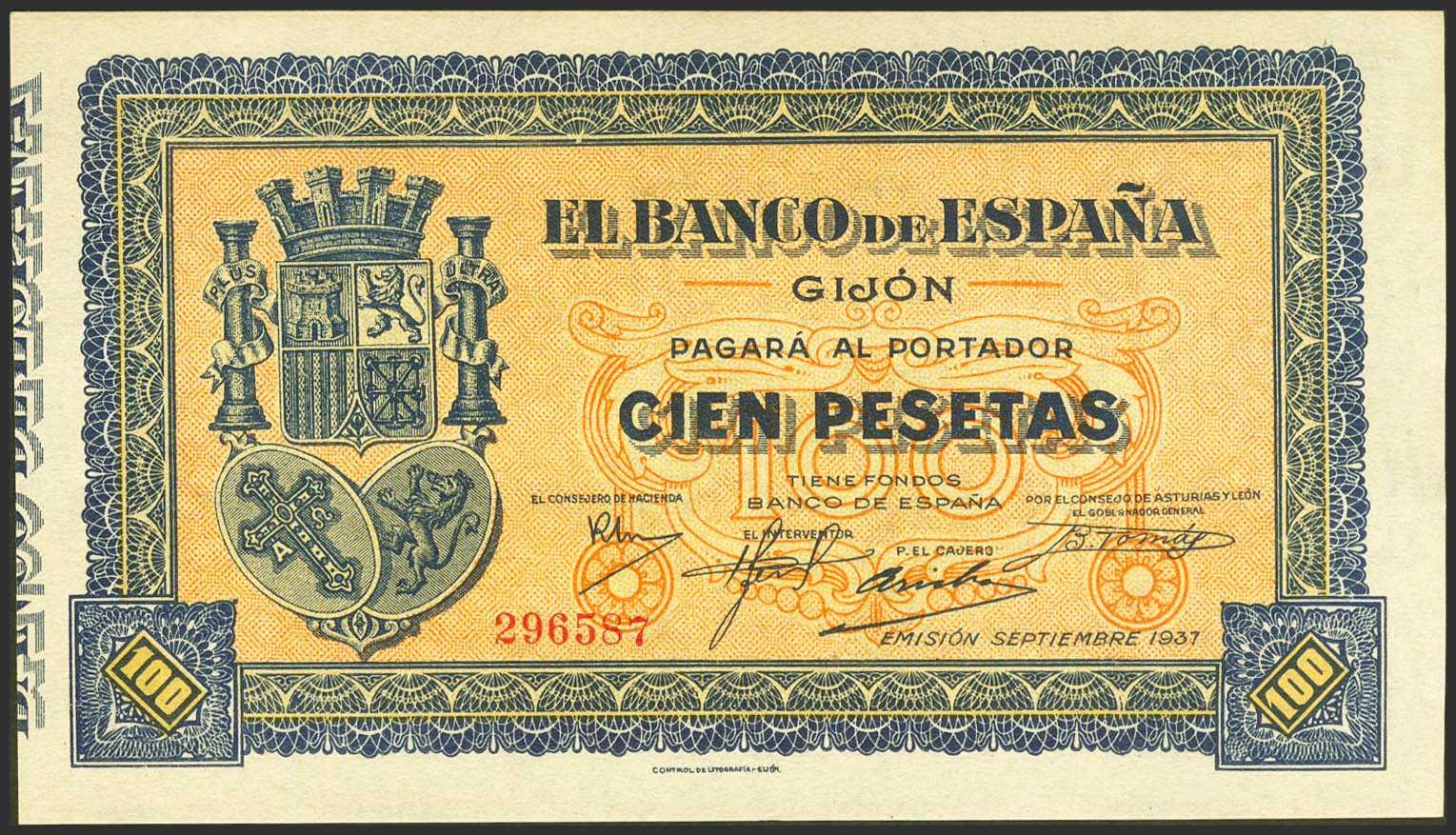 100 Pesetas. Septiembre 1937. Asturias y León. Sin serie. (Edifil 2021: 399, Pick: S580). Conserva todo su apresto original. SC-.