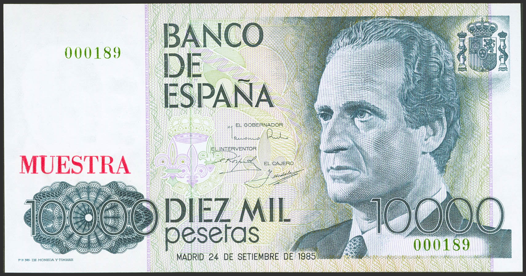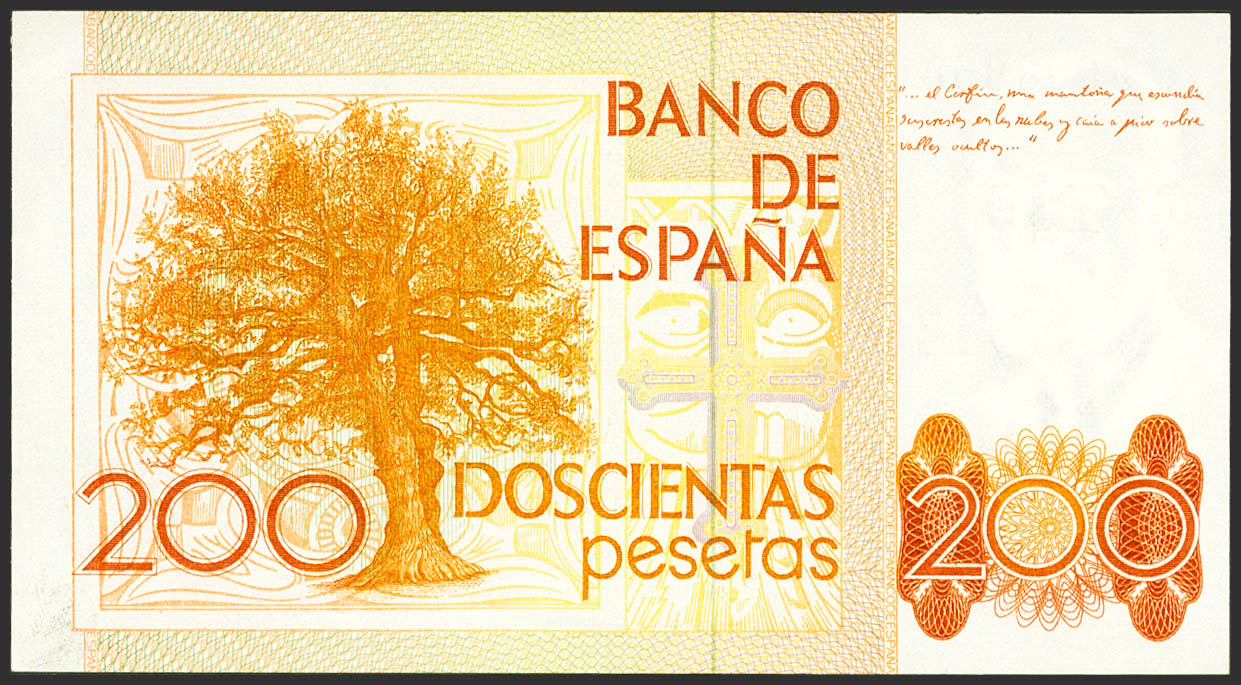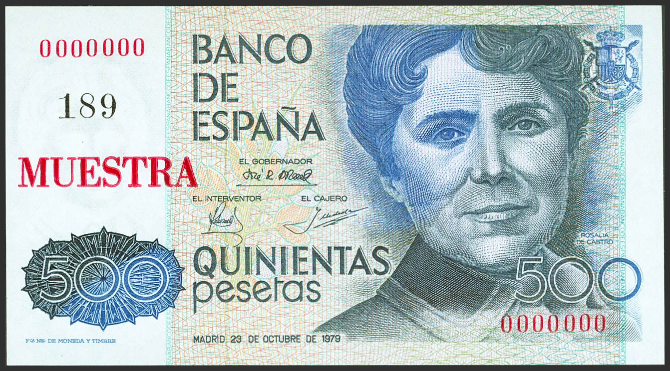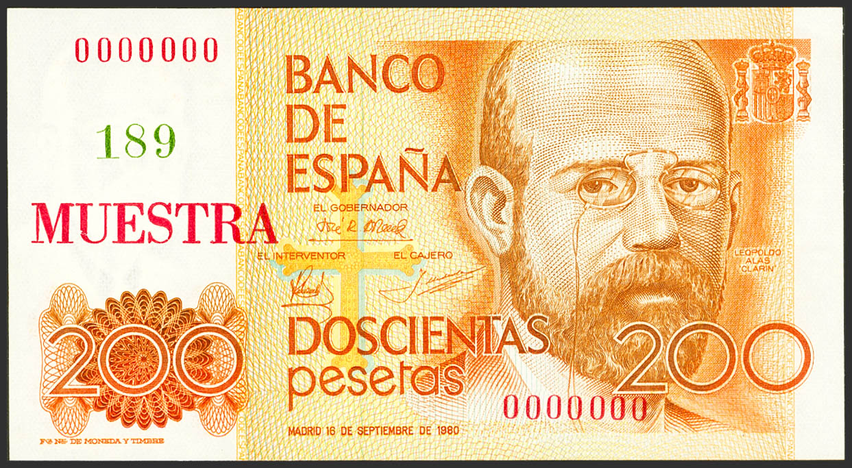Conjunto de los 6 billetes de 200 Pesetas, 500 Pesetas, 1000 Pesetas, 2000 Pesetas, 5000 Pesetas y 10000 Pesetas emitidos entre el 23 de Octubre de 1979 y el 24 de Septiembre de 1985, todos ellos con la misma numeración MUESTRA Nº189 y Nº0000000. (Edifil 2021: 476/81M, Pick: 156/61s). Conjunto extraordinariamente raro. SC/SC-.