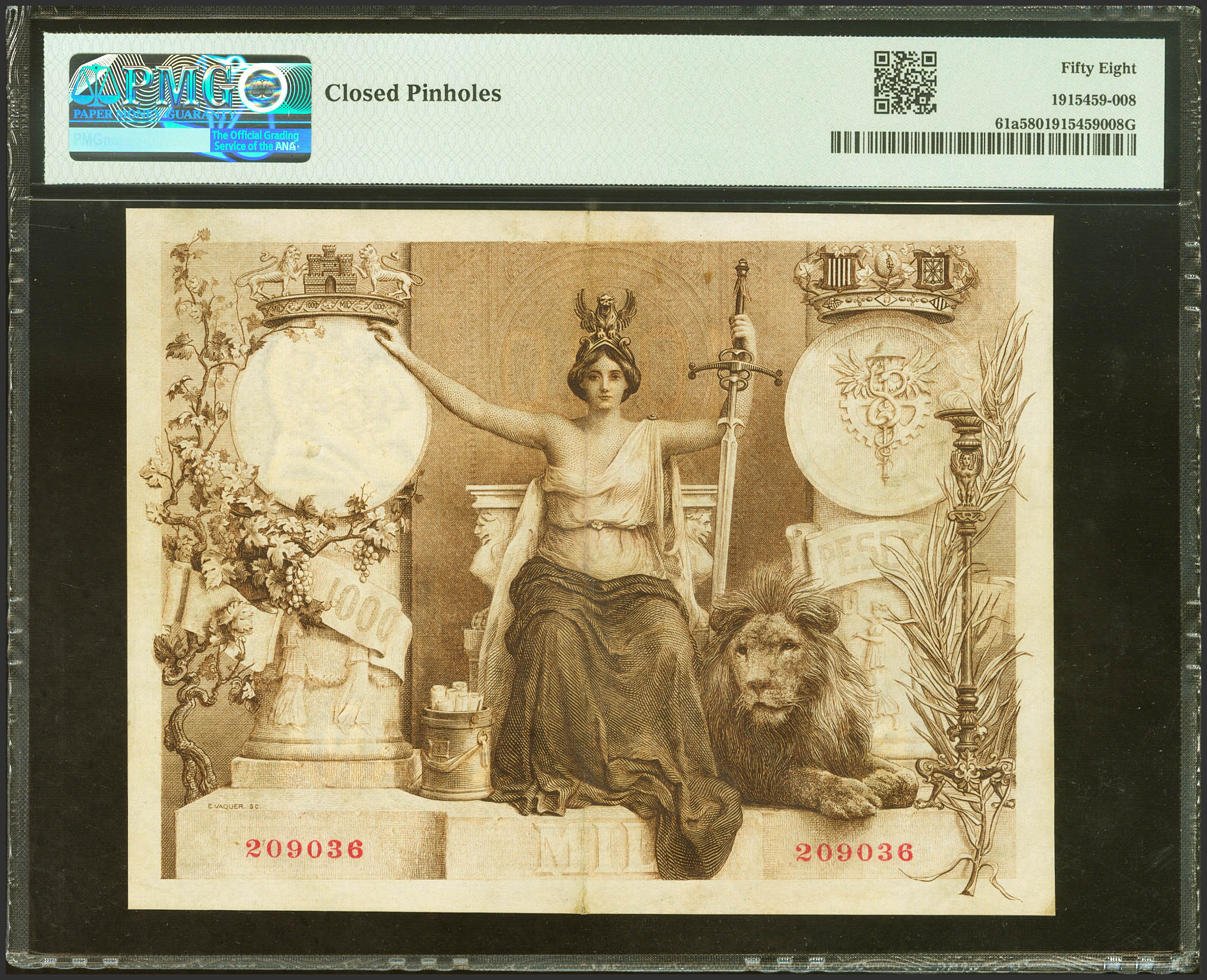 1000 Pesetas. 10 de Mayo de 1907. Sin serie. (Edifil 2021: 317, Pick: 61a). Muy raro, especialmente sin ninguna reparación y en esta excepcional calidad, puntitos de aguja imperceptibles. EBC+++. Encapsulado PMG58 (closed pinholes)(para hacernos idea de la rareza, a fecha 1 de Noviembre de 2023, el billete se trata del mejor calificado en PMG).
