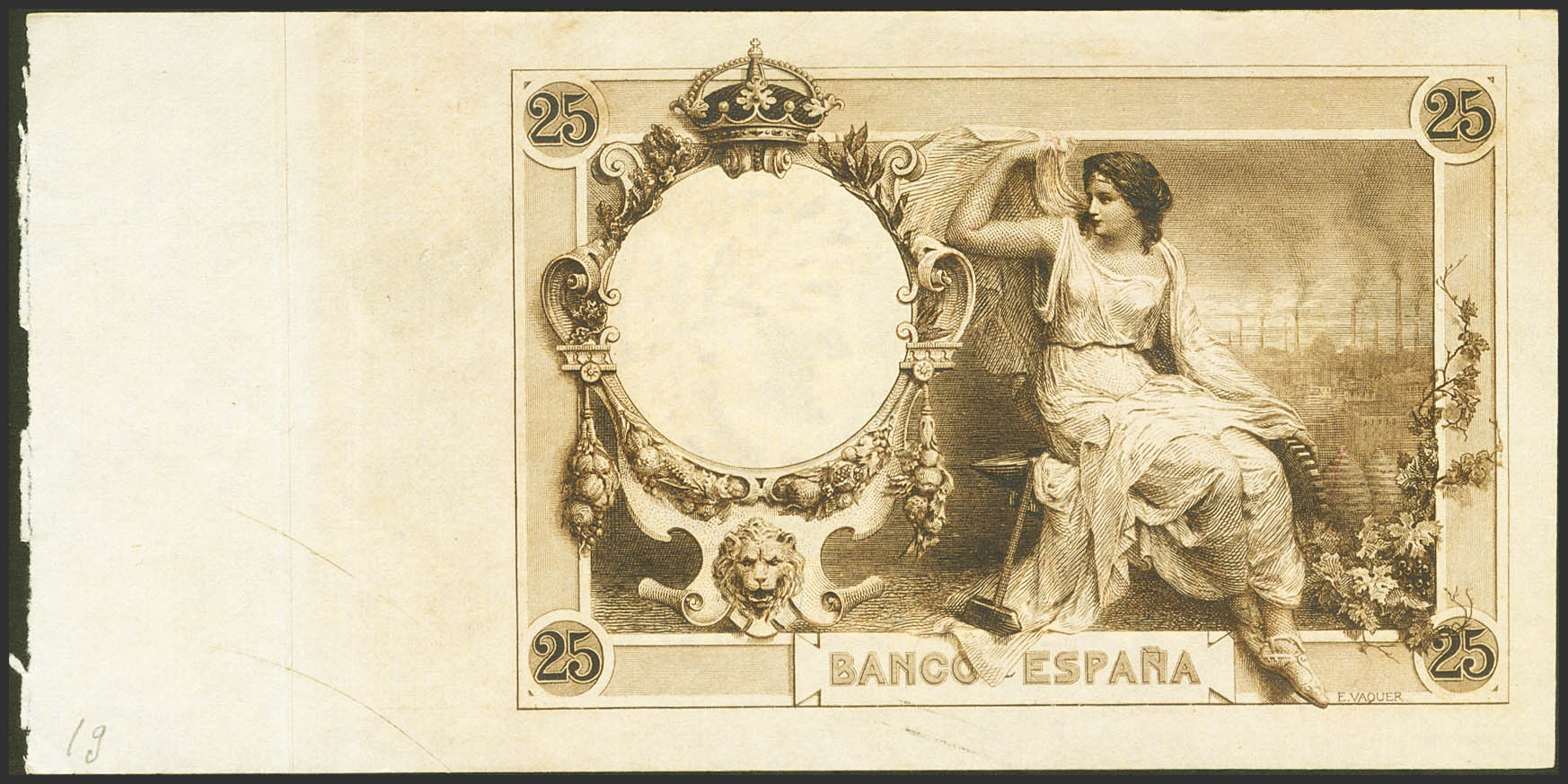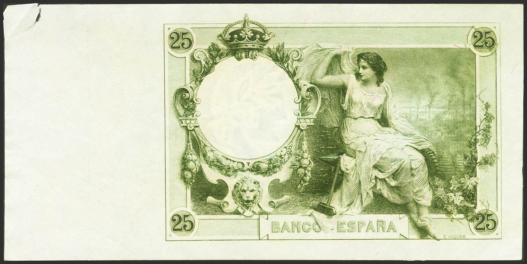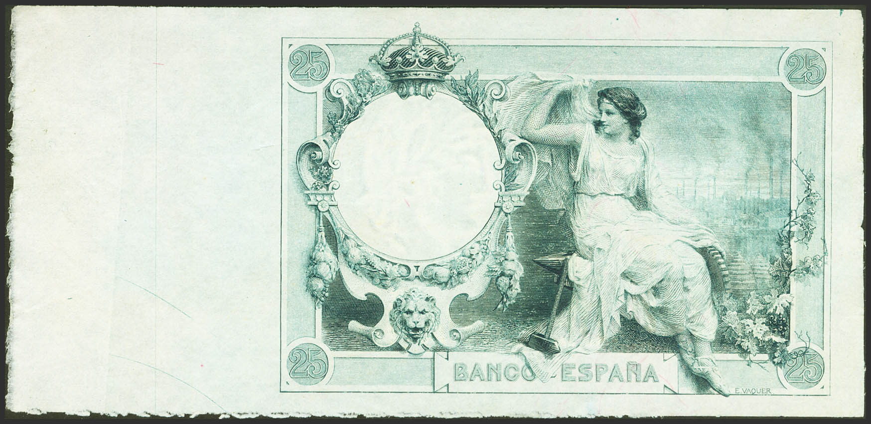 Impresionante conjunto de 7 pruebas de color del reverso del 25 Pesetas no emitido en diferentes colores (deben estar representados la mayoría de colores conocidos), de la emisión del 1 de Diciembre de 1908, con bordes del pliego a la izquierda. (Edifil 2021: NE14Pb). SC/SC-.