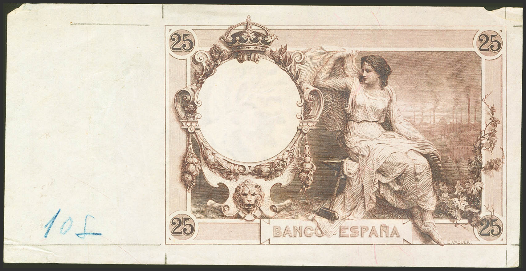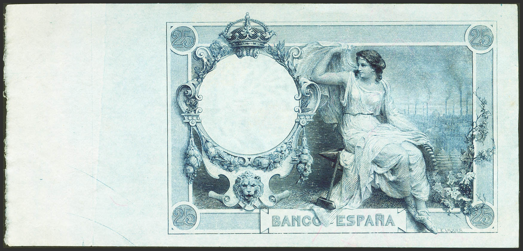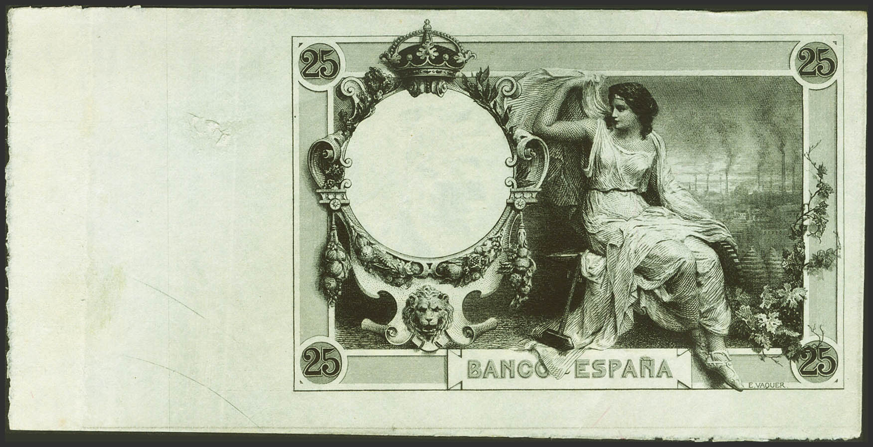 Impresionante conjunto de 7 pruebas de color del reverso del 25 Pesetas no emitido en diferentes colores (deben estar representados la mayoría de colores conocidos), de la emisión del 1 de Diciembre de 1908, con bordes del pliego a la izquierda. (Edifil 2021: NE14Pb). SC/SC-.