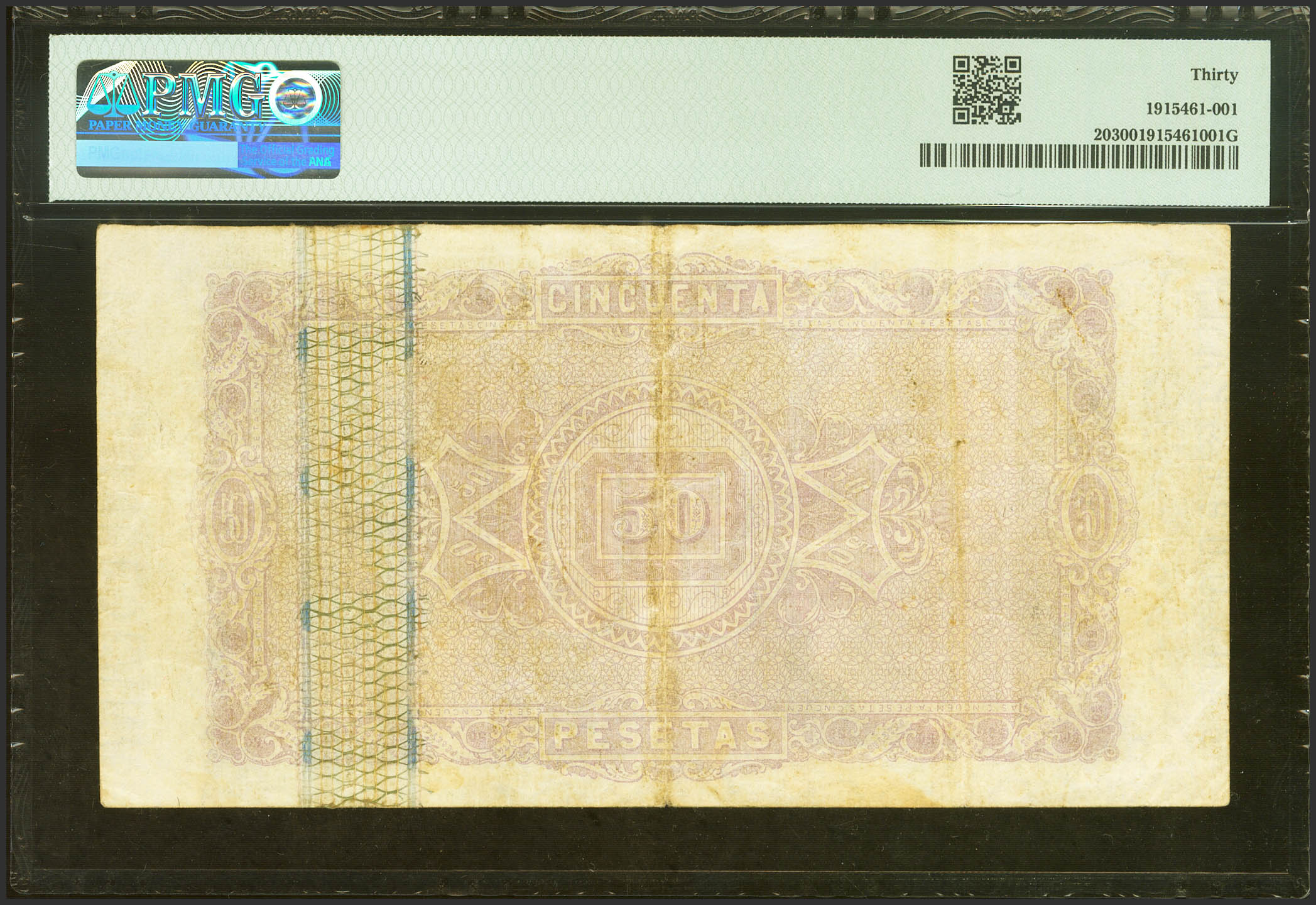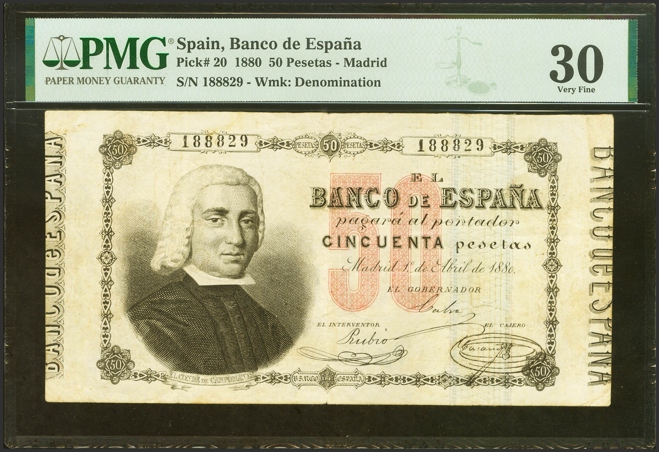 50 Pesetas. 1 de Abril de 1880. Sin serie. (Edifil 2021: 277, Pick: 20). Extraordinariamente raro, especialmente sin ninguna reparación. MBC+. Encapsulado PMG30 (para hacernos idea de la rareza, a fecha 1 de Noviembre de 2023, se trata del único billete calificado en PMG).En pleno proceso de expansión de sucursales y billetes por el territorio nacional, el Banco de España decidió cortar los contratos con ingleses y americanos para volver a fabricar los billetes en sus talleres. Así surgió la emisión de 1878, seguida luego de la de 1880. La primera fue dedicada íntegramente a escritores (aunque Pablo de Céspedes destacó en más artes), mientras que la de 1880 está compuesta por dos pintores, un poeta y un político. Rara elección esta última, en tanto que no destacó en ninguna de las artes mayores a las que se habían dedicado billetes hasta ese momento (aparte de las alegorías se habían usado retratos de pintores, escritores, escultores y arquitectos). Así pues, ¿por qué Pedro Rodríguez de Campomanes aparecía en un billete en 1880? Es de suponer que más allá de pertenecer a una época dorada a cuyos personajes años más tarde se homenajearía en otros billetes, la razón principal de incluir a Campomanes no es la política, sino su faceta escritora. Estudioso de lenguas antiguas y modernas, fue traductor de árabe y griego y también autor de una inmensa obra sobre los templarios. Su amor por la historia y sus trabajos lo llevaron a presidir en dos ocasiones la Real Academia de la Historia. Obviamente, su mayor producción la enfocó a la economía y a la política y eso le llevó a ser nombrado ministro de Hacienda en 1760 y poco después fiscal del Consejo de Castilla, que luego presidiría. Años más tarde impulsaría la creación de las Sociedades Económicas de Amigos del País, de carácter ilustrado. De tal modo, Campomanes siempre se rodeó en su casa de artistas y pensadores, como Mengs, Ventura Rodríguez, Jovellanos o Cabarrús, por citar sólo a algunos.Este billete, del que apenas quedan media docena a disposición del coleccionista, entró curiosamente en circulación bastante tarde cuando ya se había establecido el billete único de cada denominación para su uso en toda España basándose precisamente en las emisiones de 1878 y 1880. En esa época se comenzaba a construir el edificio del Banco de España en la confluencia de la calle Alcalá con el Paseo del Prado. En 1880 un billete de 50 pesetas servía para comprar un décimo de la Lotería de Navidad, lo que podía suponer casi un sueldo mensual para muchos trabajadores sin demasiada cualificación. Así pues, a pesar de su baja denominación, no debió ser un billete común entre el ciudadano medio. Con un billete así se podía comprar mucha comida y mucha ropa y es de suponer que no quedaban guardados habitualmente. Y cómo no, fue un billete que acabó siendo falsificado.