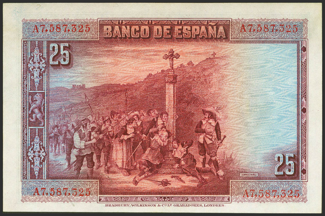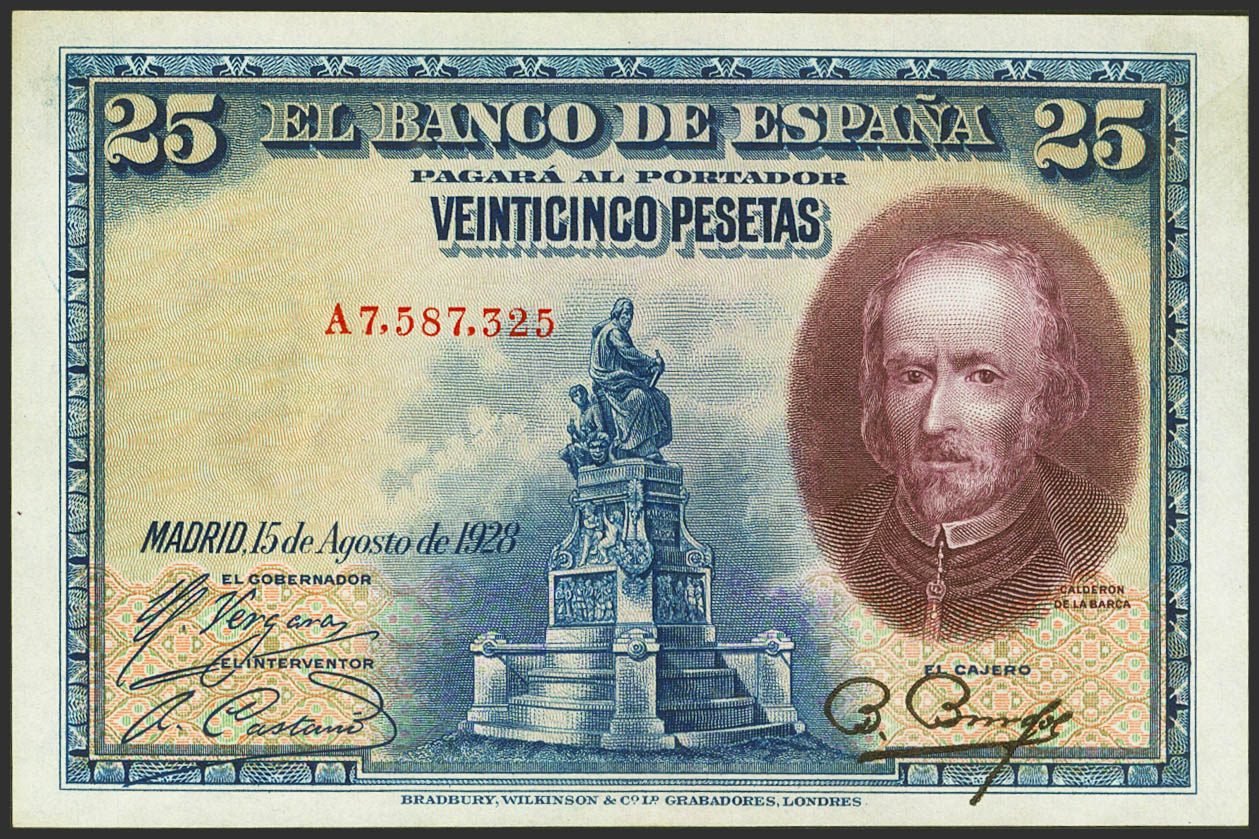 25 Pesetas. 15 de Agosto de 1928. Serie A y numeración hasta 7780000. (Edifil 2021: 328a, Pick: 74b). Conserva gran parte del apresto original. EBC+.