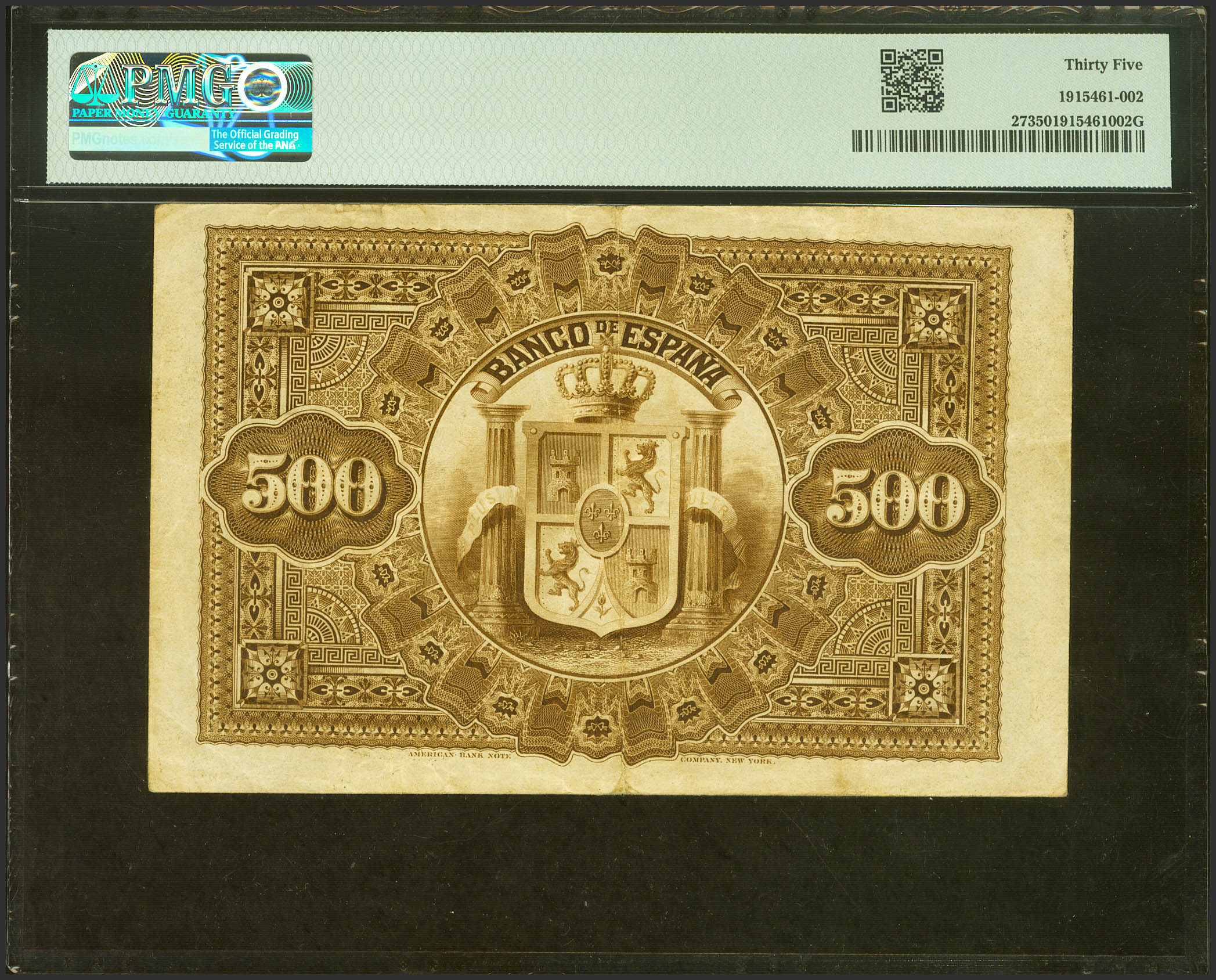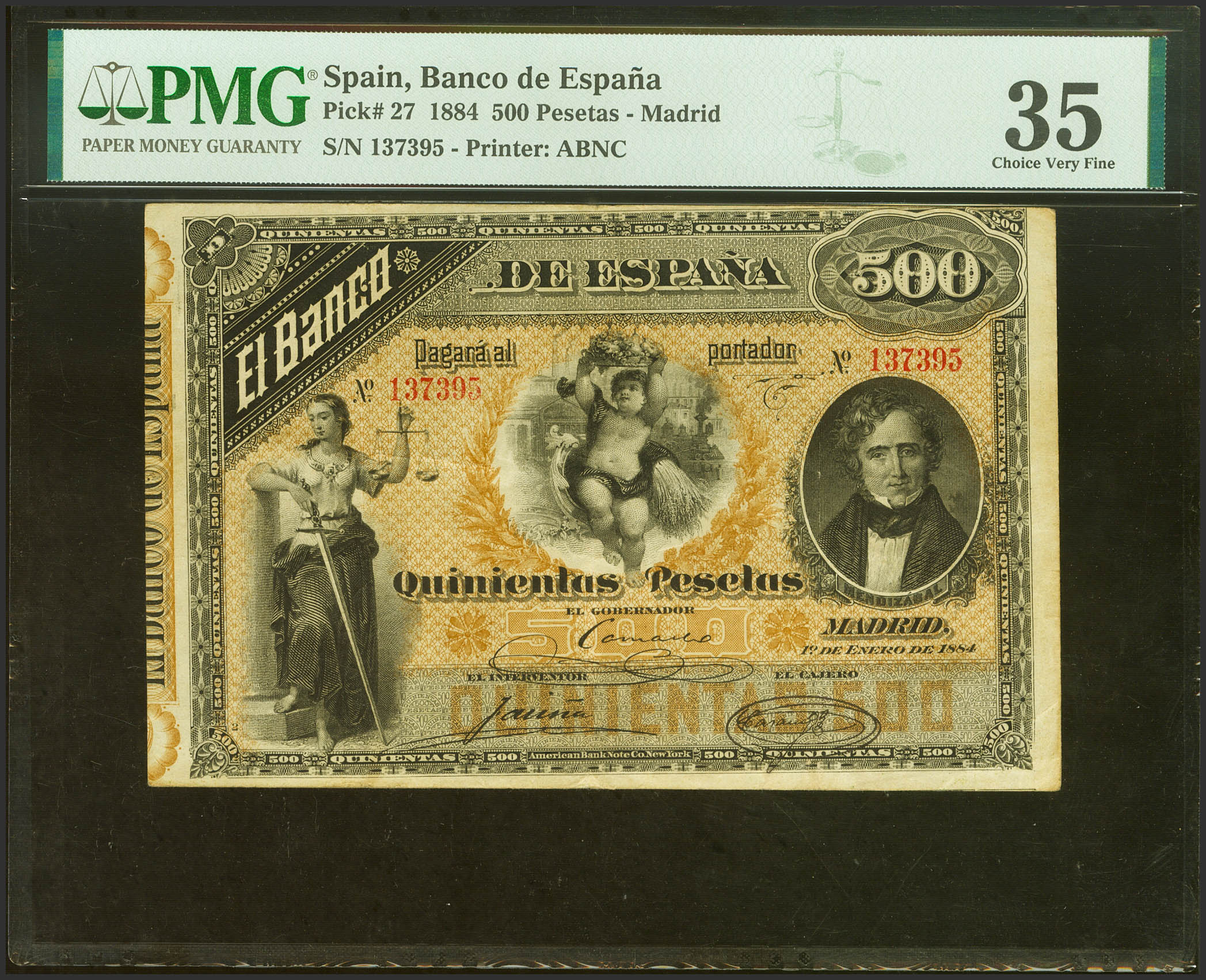 500 Pesetas. 1 de Enero de 1884. Sin serie. (Edifil 2021: 285, Pick: 27). Extraordinariamente raro especialmente sin ninguna reparación. MBC+. Encapsulado PMG35 (para hacernos idea de la rareza, a fecha 1 de Noviembre de 2023, este billete es el mejor calificado junto a otro billete en PMG, no hay más billetes registrados).La emisión de enero de 1884 fue encargada a la American Bank Note Company, seguramente en un intento de incrementar la seguridad de los billetes españoles. El resultado, si bien estéticamente es extraordinario, no fue el deseado, pues todos y cada unos de esos billetes resultaron falsificados. Tal fue el fracaso de la emisión (y el enfado por el repetido uso de la viñeta de las 25 pesetas) que el Banco de España cortó las relaciones con los americanos de raíz y retornó a su taller de la calle Atocha para seguir produciendo billetes. No obstante, el Banco puso en circulación toda la serie en un largo lapso de tiempo.Las emisiones de 1884 (enero y julio) supusieron una explosión de dedicatorias a políticos, pero ya no necesariamente del siglo anterior (que los hubo), sino también a algunos apenas unos años después de su fallecimiento (como es el caso de Alejandro Mon). La mayoría de estos personajes fueron ministros de Hacienda (tan sólo Floridablanca caería fuera de esa categoría).Un billete de esta alta denominación suponía un dineral en la época, incluso para aquellos con cargos acomodados. El director de la sucursal del Banco de España en Barcelona, el mejor pagado, cobraba dos de estos billetes al mes. Pero para la mayoría de los mortales, un billete como este suponía, como poco, el sueldo de varios meses, si no incluso de un año de trabajo.