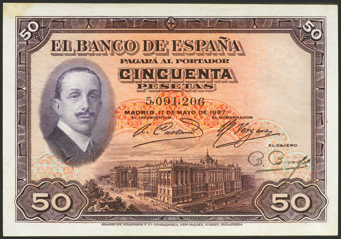 50 Pesetas. 17 de Mayo de 1927. Sin serie y sello en seco GOBIERNO PROVISIONAL DE LA REPUBLICA / 14 ABRIL 1931. (Edifil 2021: 339, Pick: 72b). Raro en esta calidad, conserva gran parte de su apresto original y manchita del tiempo en la esquina superior izquierda. EBC+++.