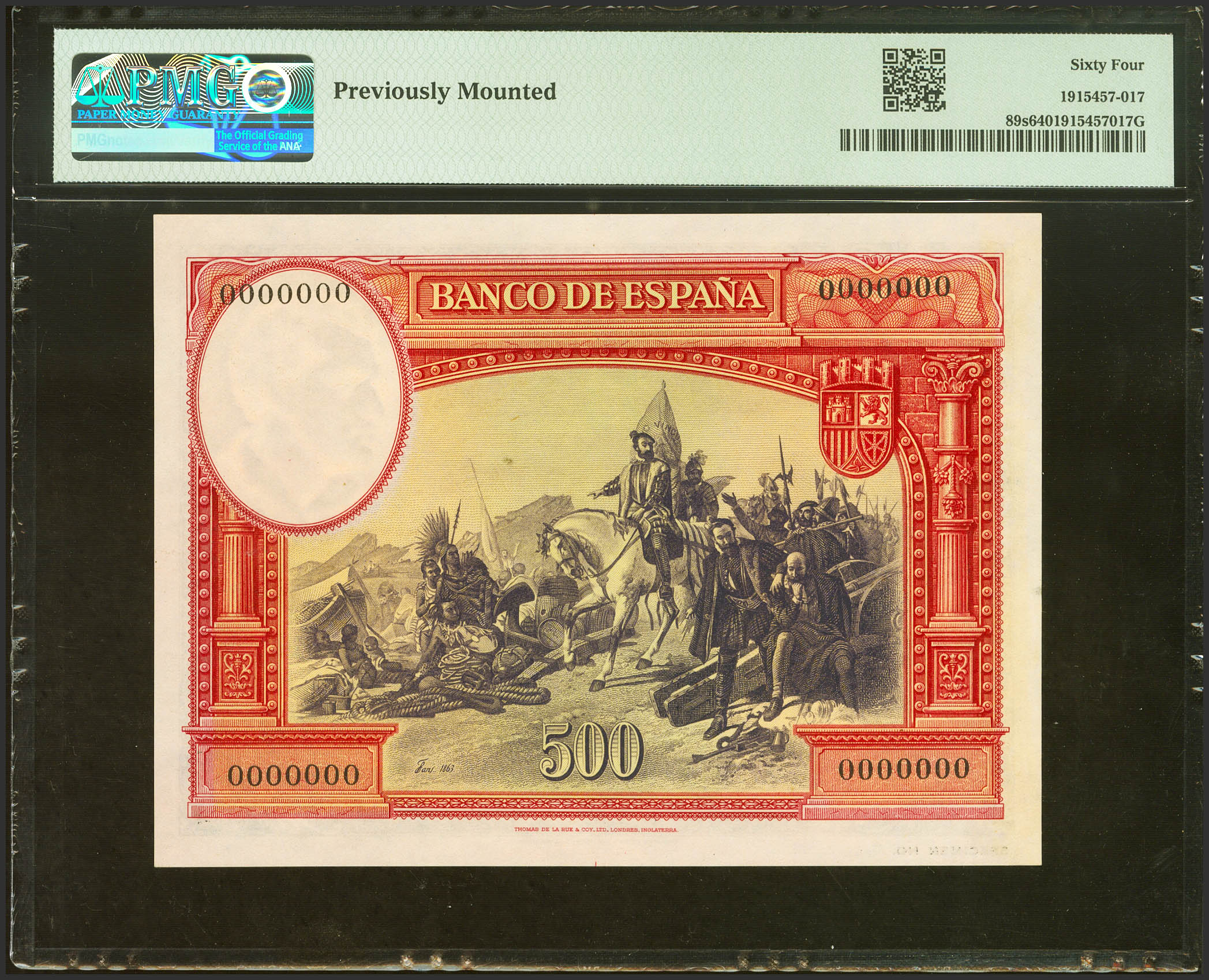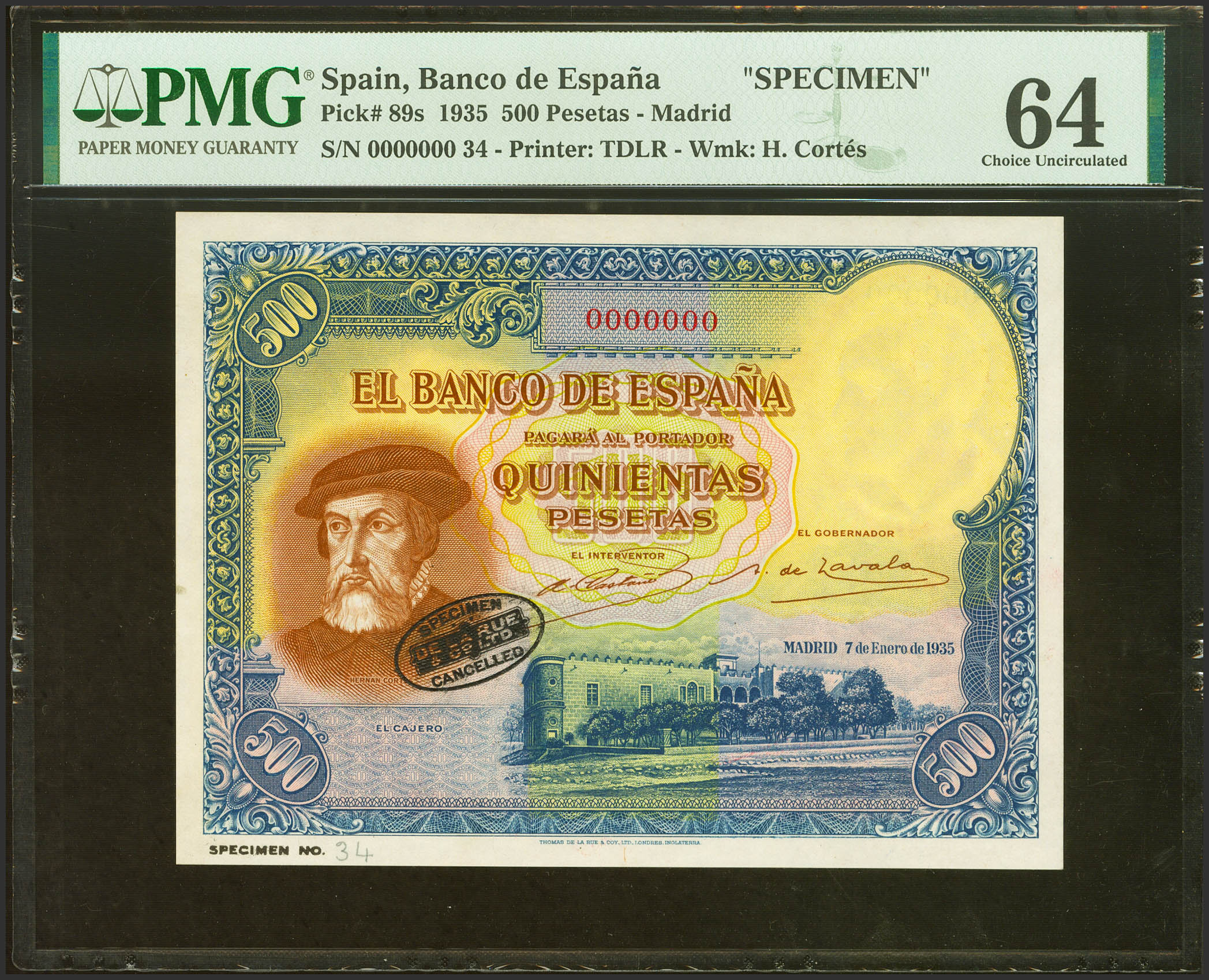 500 Pesetas. 7 de Enero de 1935. Specimen Nº34, numeración 0000000, marca en negro de La Rue y sin firma del cajero. (Edifil 2021: 365Ma, Pick: 89s). Rarísimo y espectacular. SC. Encapsulado PMG64 ("previously mounted", como la mayoría de los que se conocen).