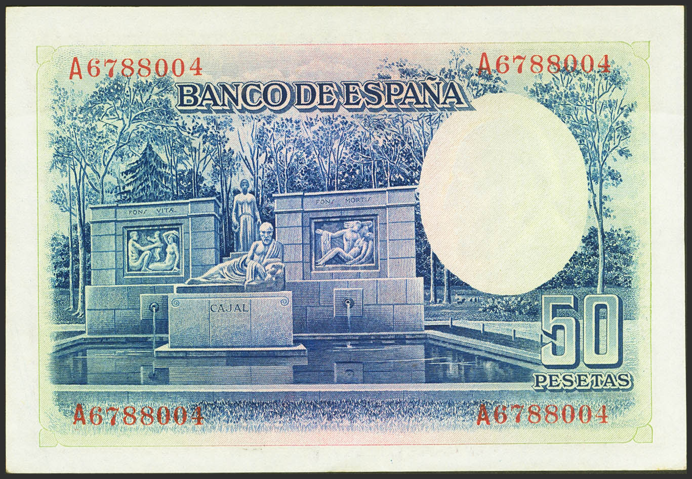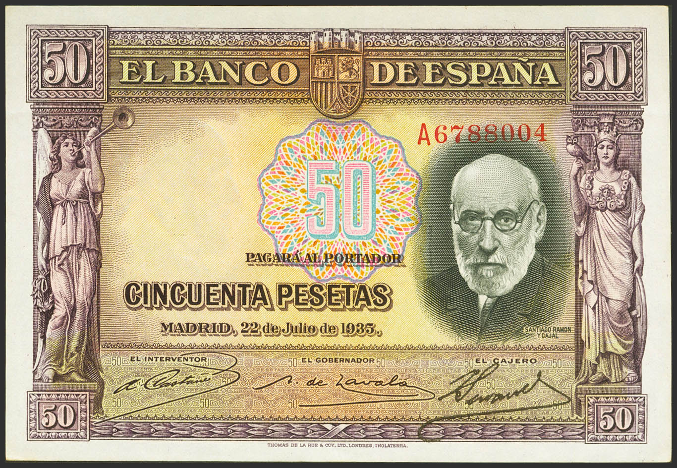 50 Pesetas. 22 de Julio de 1935. Serie A. (Edifil 2021: 366a, Pick: 88b). Ondulación natural del proceso de fabricación (este es el único motivo de "quitarle" el SC), conserva gran parte de su apresto original. EBC+.