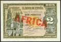 2 Pesetas. 30 de Abril de 1938. Serie M. (Edifil 2021: 429A). Sobrecarga tipográfica AFRICA, en rojo. Extremadamente raro, conserva todo su apresto original. SC-. Coincide con el fotografiado en el catálogo Edifil y el subastado en la Subasta de Caja Madrid.La diferenciación del dinero circulante en algunos territorios de un país es un mecanismo ideado originalmente para evitar la fuga de capitales y mantener suficiente numerario en esa zona. Un mecanismo simple para realizar esta tarea es la utilización de sellos, húmedos o secos. Una Orden Ministerial de 22 de abril de 1939 instó a estampillar la palabra “AFRICA” sobre las emisiones franquistas de 1938, en teoría con la justificación de prevenir el contrabando en el Protectorado de Marruecos, cifrado en unos 300 millones de pesetas. Sólo esos podrían circular en la región, evitándose su entrada ilegal en el resto del territorio español. La idea de este proyecto fue de Juan Beigbeder Atienza, por entonces Alto Comisario de España en Marruecos. Nunca existió una reglamentación oficial sobre el asunto, tan sólo dos propuestas del Ministerio de Hacienda, y no se llegaron a poner en circulación por miedo a la bajada de la cotización de la peseta en la zona de Tánger. Sí se grabaron unos cuños con la estampilla y se procedió a la estampación tipográfica en diagonal en el anverso de una serie de billetes. No está claro si se limitaron a crear una serie de muestra o si efectivamente se estampillaron millones de pesetas, porque los supervivientes son mínimos.Existen también falsificaciones de estos sellos realizadas mediante tampones húmedos en tiempos modernos. Las planchas originales, como se ha mencionado para impresión tipográfica, cuentan con un sutil entramado en el interior de cada letra precisamente para dificultar las falsificaciones; los tampones modernos no la pueden reproducir.Huelga decir que estos billetes, auténticos, son extraordinariamente raros, si no únicos.