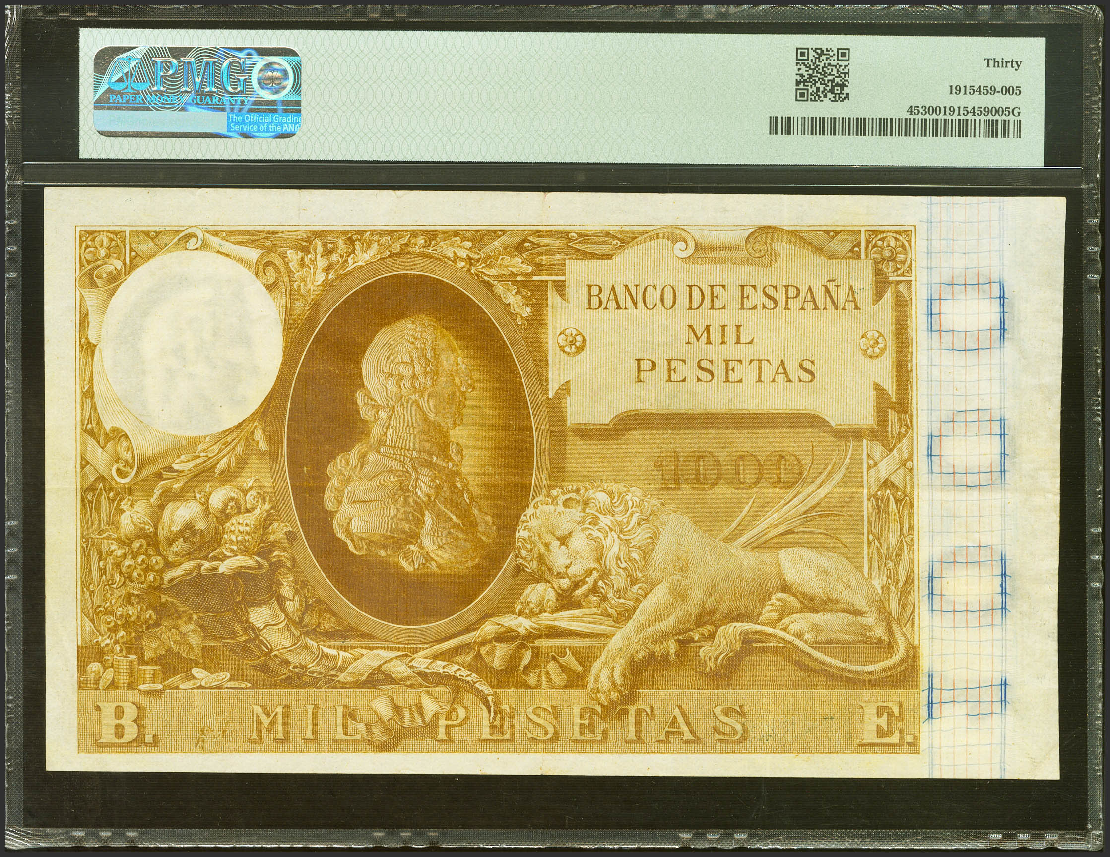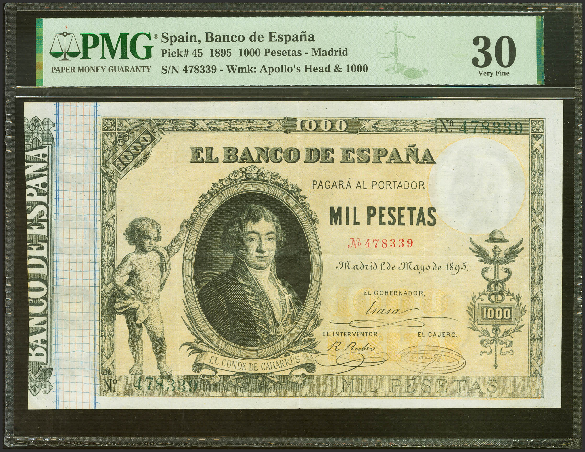 1000 Pesetas. 1 de Mayo de 1895. Sin serie. (Edifil 2021: 303, Pick: 45). Muy raro, billete de espectacular presencia, que se ve realzada por sus enormes dimensiones. MBC+. Encapsulado PMG30.