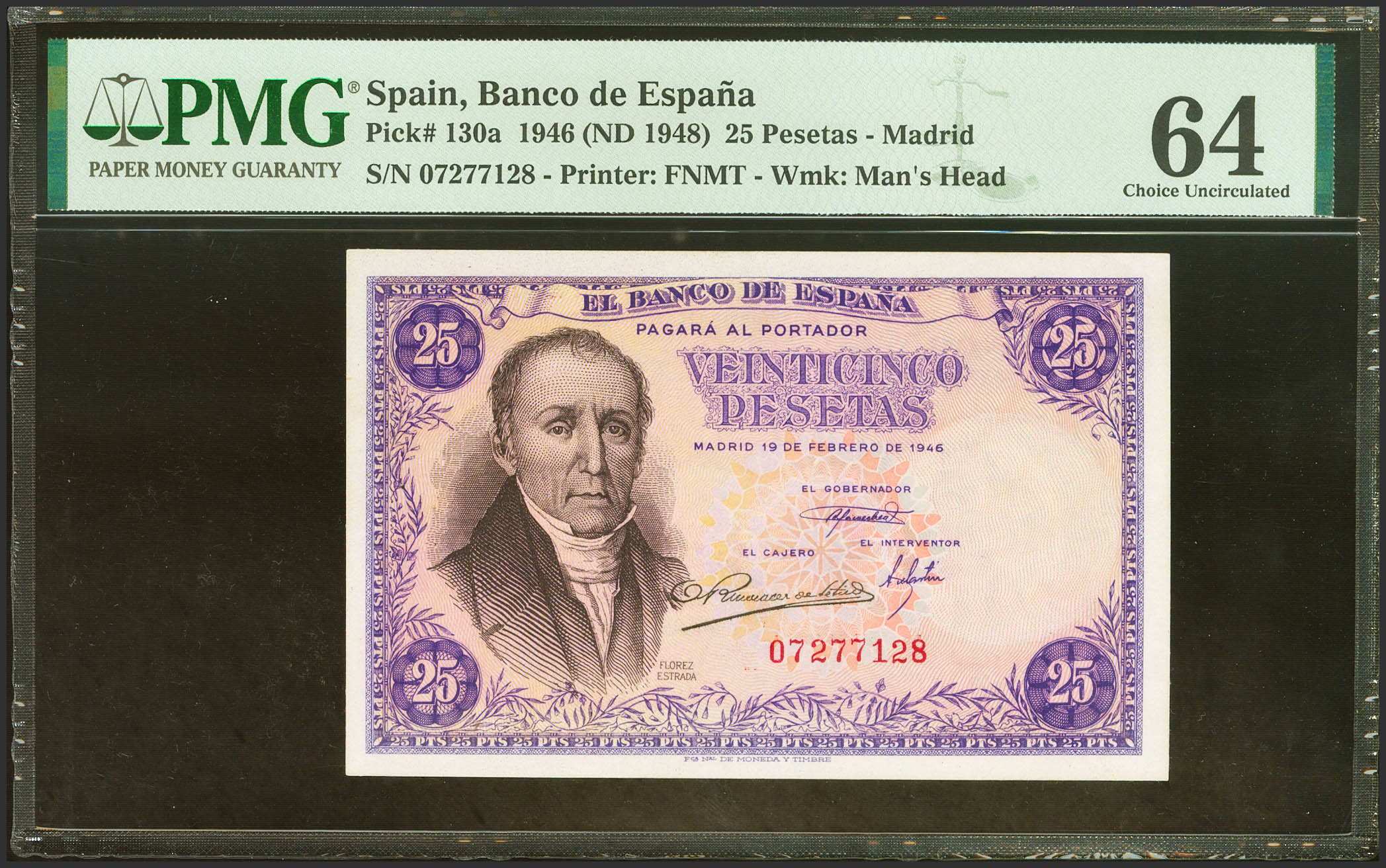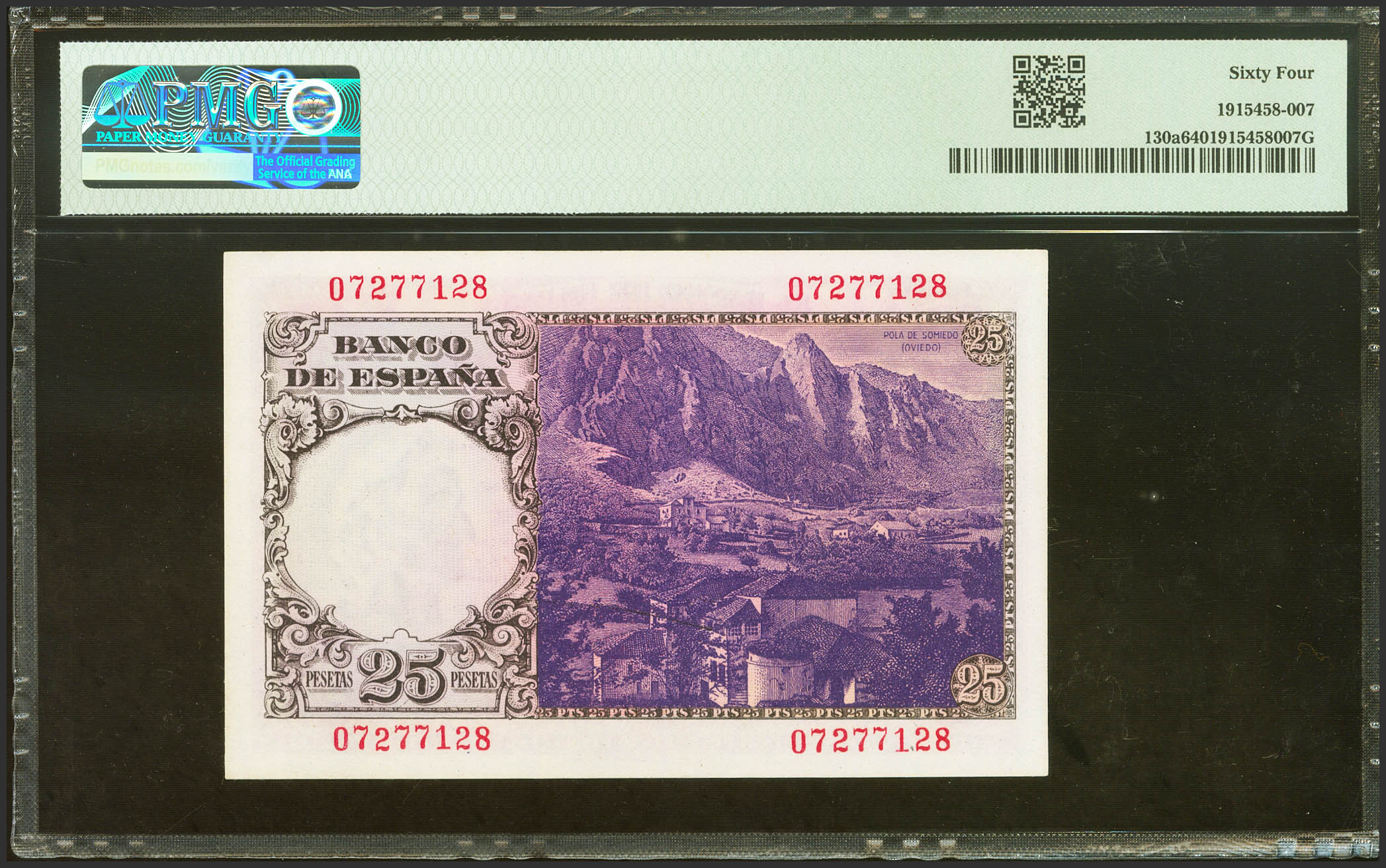 25 Pesetas. 19 de Febrero de 1946. Sin serie. (Edifil 2021: 450, Pick: 130a). Inusual en esta calidad. SC. Encapsulado PMG64.