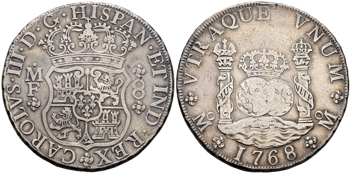 CARLOS III (1759-1788). 8 Reales (Ar. 26,68g/39mm). 1768. México MF. (Cal-2019-1094). MBC.