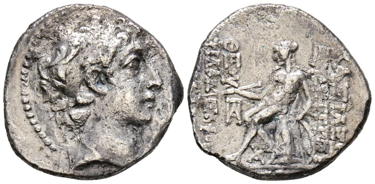 IMPERIO SELEUCIDA, Demetrios II Nikator. Dracma. (Ar. 3,74g/18mm). 145-144 a.C. Antioquía en el Orontes. (Seaby 1908.4d; HGC 976d). Anv: Cabeza masculina laureada a derecha. Rev: Apolo sentado sobre omphalos a izquierda portando flecha y apoyado sobre arco, delante y entre las piernas monograma, alrededor leyenda griega. MBC-.