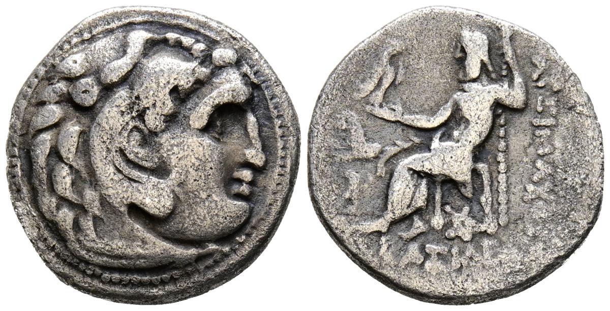 REYES DE TRACIA, Lysimachos. Dracma. (Ar. 4,01g/17mm). 305-281 a.C. Kolophon. (Price 1840; HGC 3, 1751d). Anv: Cabeza de Heracles con piel de león a derecha. Rev: Zeus sentado a izquierda portando cetro y águila, debajo del trono pentagrama, delante parte delantera de león y letra griega, detrás leyenda griega. MBC-.