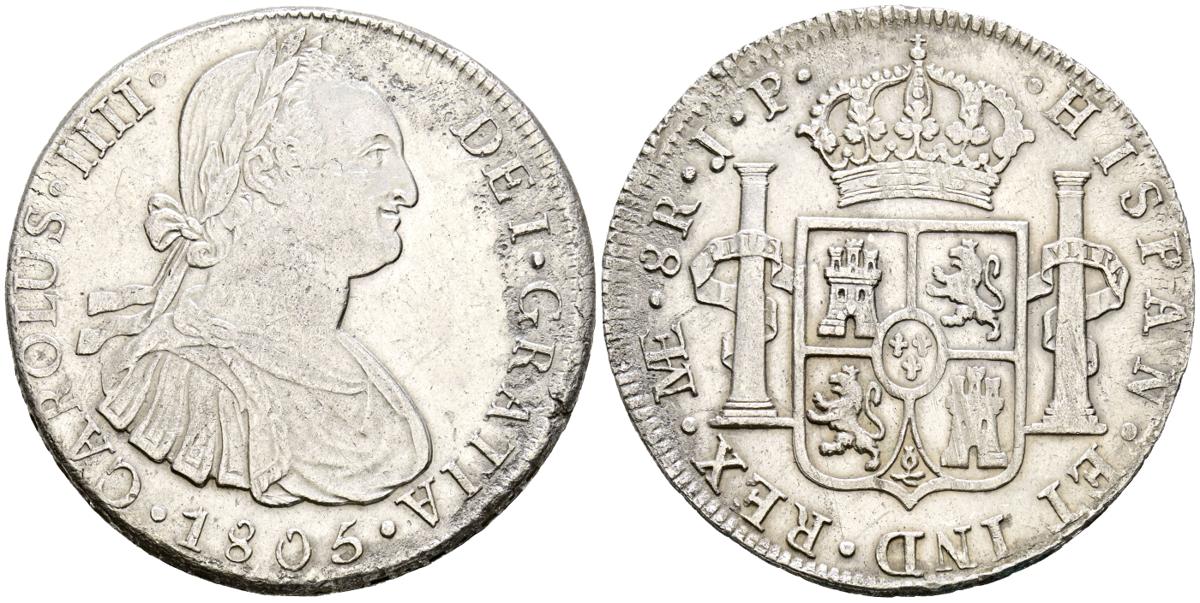 CARLOS IV (1788-1808). 8 Reales. (Ar. 26,68g/39mm). 1805. Lima JP. (Cal-2019-925). MBC+. Oxidaciones limpiadas. Buen ejemplar.