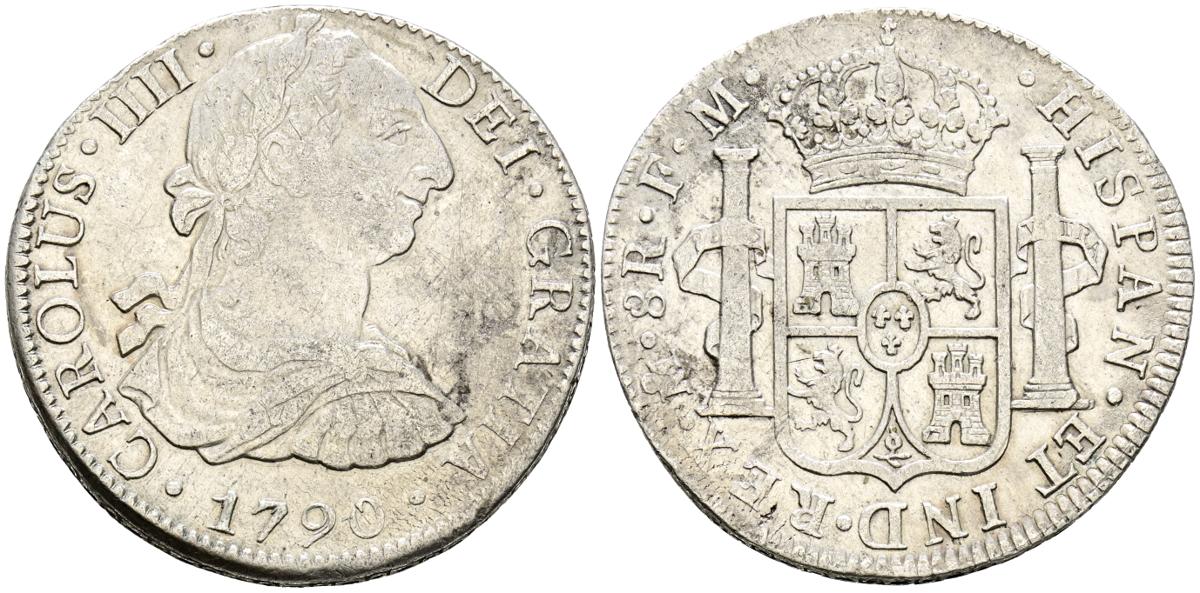 CARLOS IV (1788-1808). 8 Reales. (Ar. 26,72g/38mm). 1790. México FM. (Cal-2019-952). Busto de Carlos III y ordinal IIII. MBC+. Escasa.