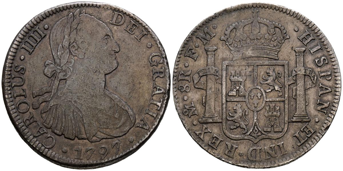 CARLOS IV (1788-1808). 8 Reales. (Ar. 26,76g/39mm). 1797. Mexico FM. (Cal-2019-960). MBC. Pátina oscura.