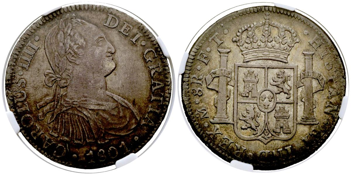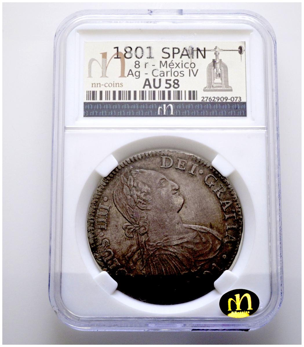 CARLOS IV (1788-1808). 8 Reales. (Ar. 27,00g/38mm)*. 1801. Mexico FT. (Cal-2019-972). Encapsulado por NN Coins AU 58. *Peso y medidas teóricos.