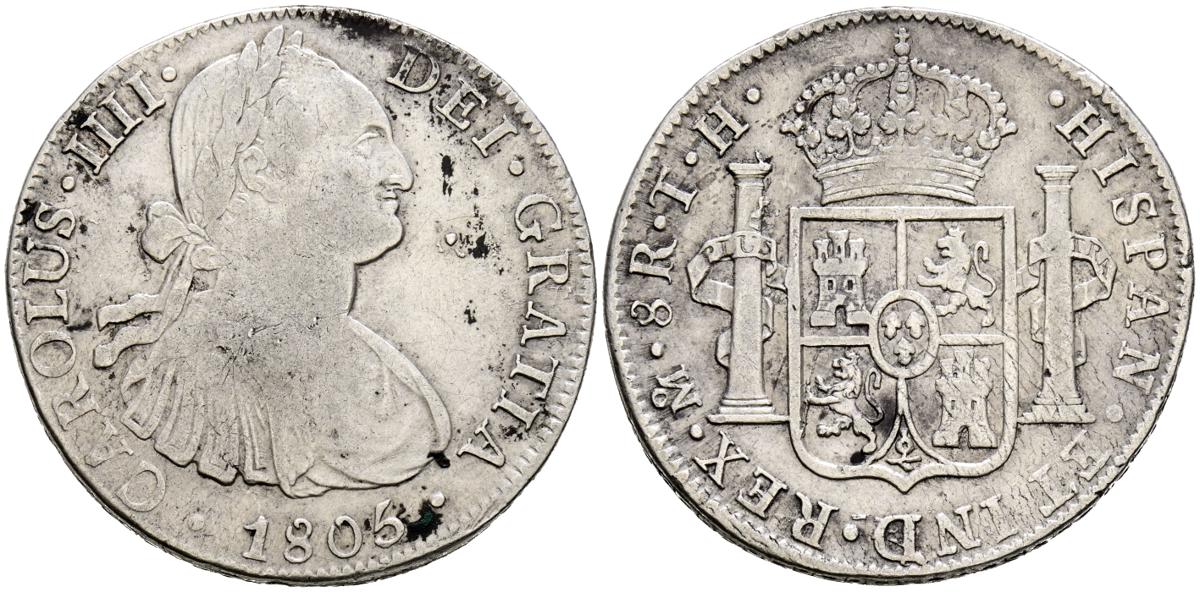 CARLOS IV (1788-1808). 8 Reales. (Ar. 26,83g/39mm). 1805. México TH. (Cal-2019-983). MBC-.