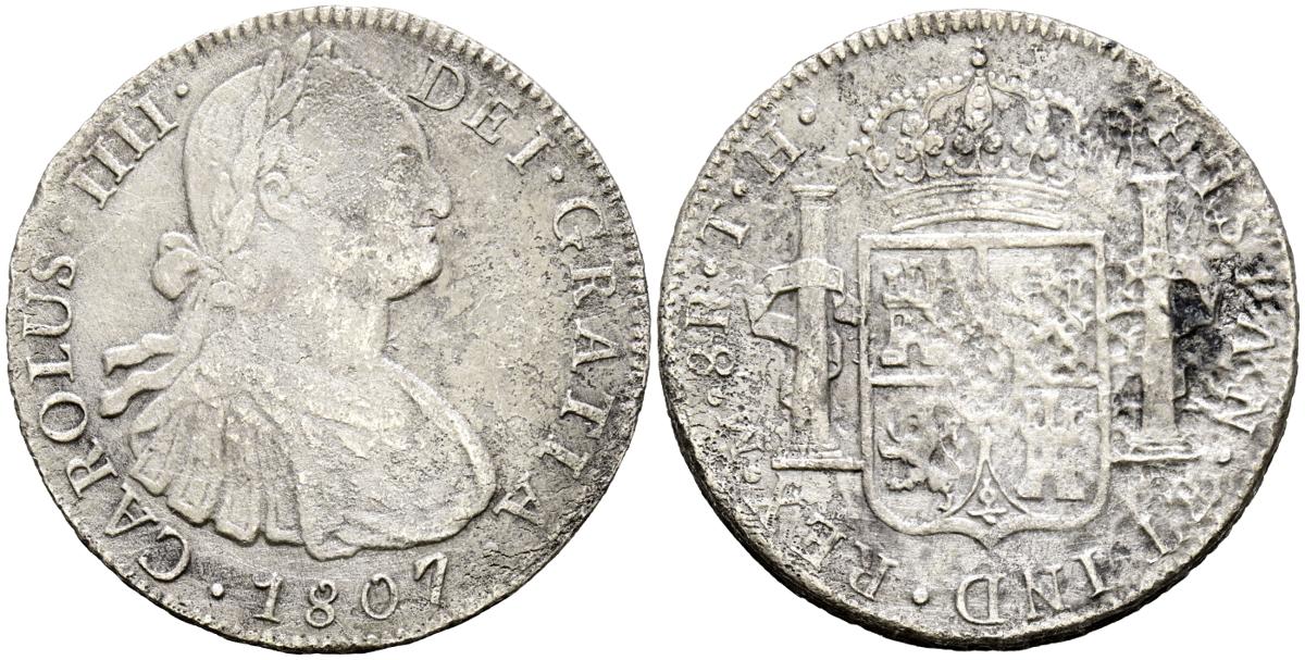 CARLOS IV (1788-1808). 8 Reales. (Ar. 24,76g/39mm). 1807. México TH. (Cal-2019-986). BC+. Oxidaciones limpiadas.
