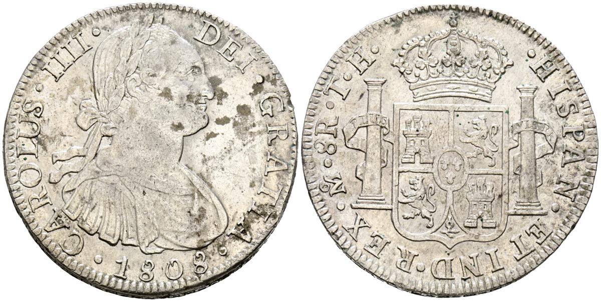 CARLOS IV (1788-1808). 8 Reales. (Ar. 26,94g/39mm). 1808. México TH. (Cal-2019-988). MBC+/EBC-. Impureza. Restos de brillo original.