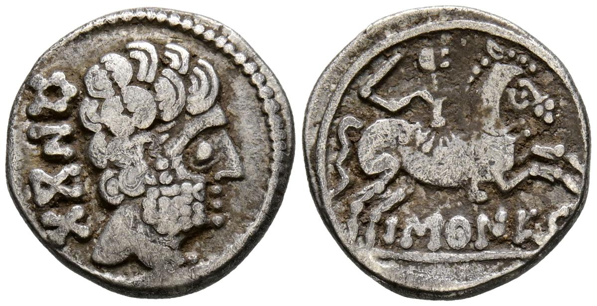 BASCUNES (Pamplona). Denario (Ar. 3,18g/17mm). 120-20 a.C. (FAB-215). Anv: Cabeza masculina barbada a derecha, detrás leyenda ibérica BeNCoDa. Rev: Jinete con espada a derecha, debajo leyenda ibérica BaSCuNES. MBC-.
