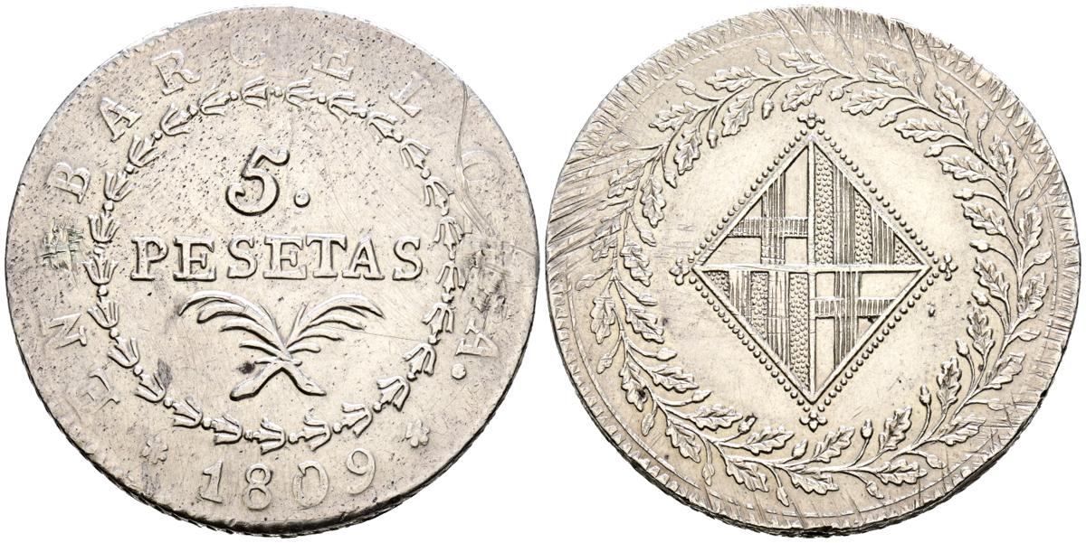 CATALUÑA NAPOLEÓNICA (1808-1814). 5 Pesetas (Ar. 26,94g/38mm). 1809. Barcelona. (Cal-2019-45). MBC. Restos de engarce.