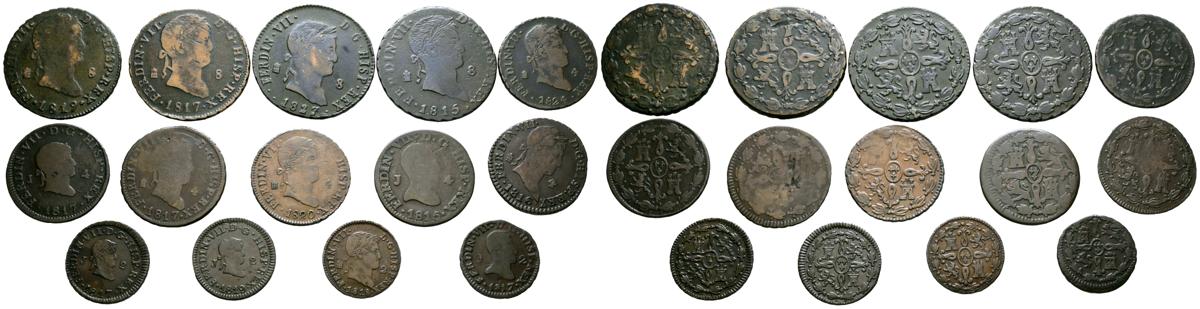 FERNANDO VII (1808-1833). Interesante conjunto de 14 cobres con módulos de 2, 4 y 8 maravedís acuñados en las cecas de Jubia y Segovia. Ninguna pieza repetida y todas procedentes de la Colección Fleming (Subasta 389. 28/04/2022. Aureo Calicó). Diferentes estados de conservación. A EXAMINAR.