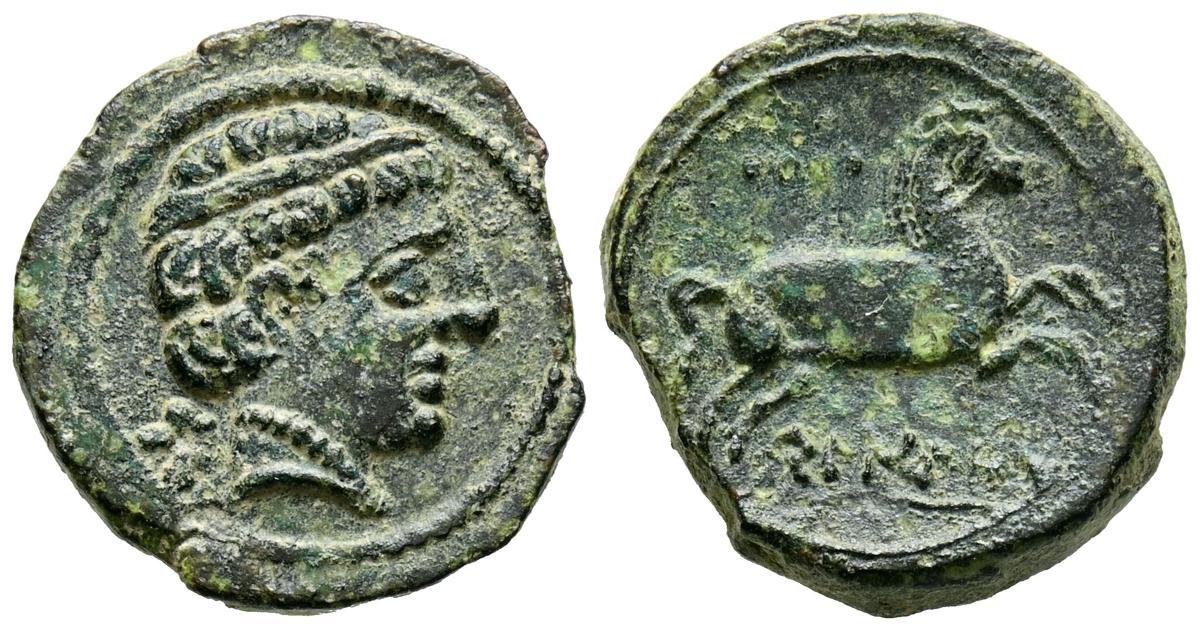 BELIGIOM (Belchite, Zaragoza). Cuadrante. (Ae. 2,75g/15mm). 180-20 a.C. (FAB-247). Anv: Cabeza diademada a derecha, detrás letra ibérica Be. Rev: Caballo saltando a derecha, encima tres puntos y debajo leyenda ibérica: BELIGio. EBC-.