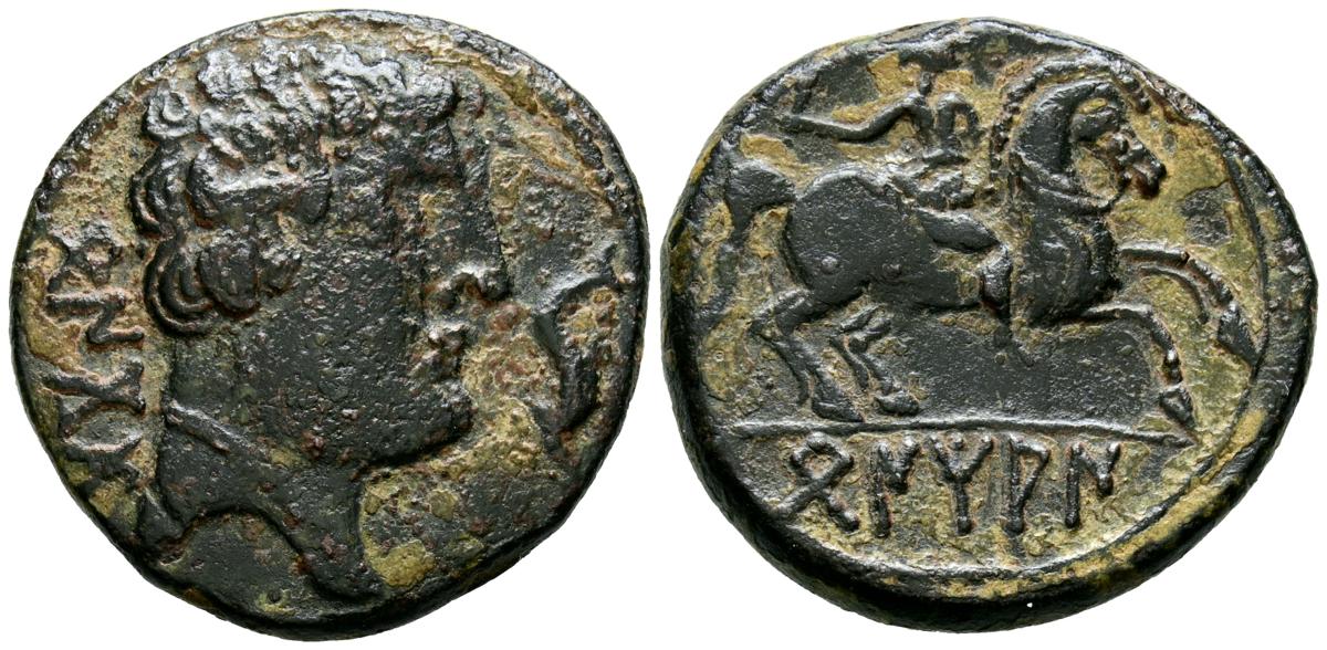BENTIAN (Zona de Navarra). As. (Ae. 9,39g/25mm). 120-80 a.C. (FAB-250). Anv: Cabeza masculina a derecha, delante delfín, detrás leyenda ibérica: BeNCoDa. Rev: Jinete con espada a derecha, debajo leyenda ibérica: BeNTiAN. MBC-. Escaso ejemplar.