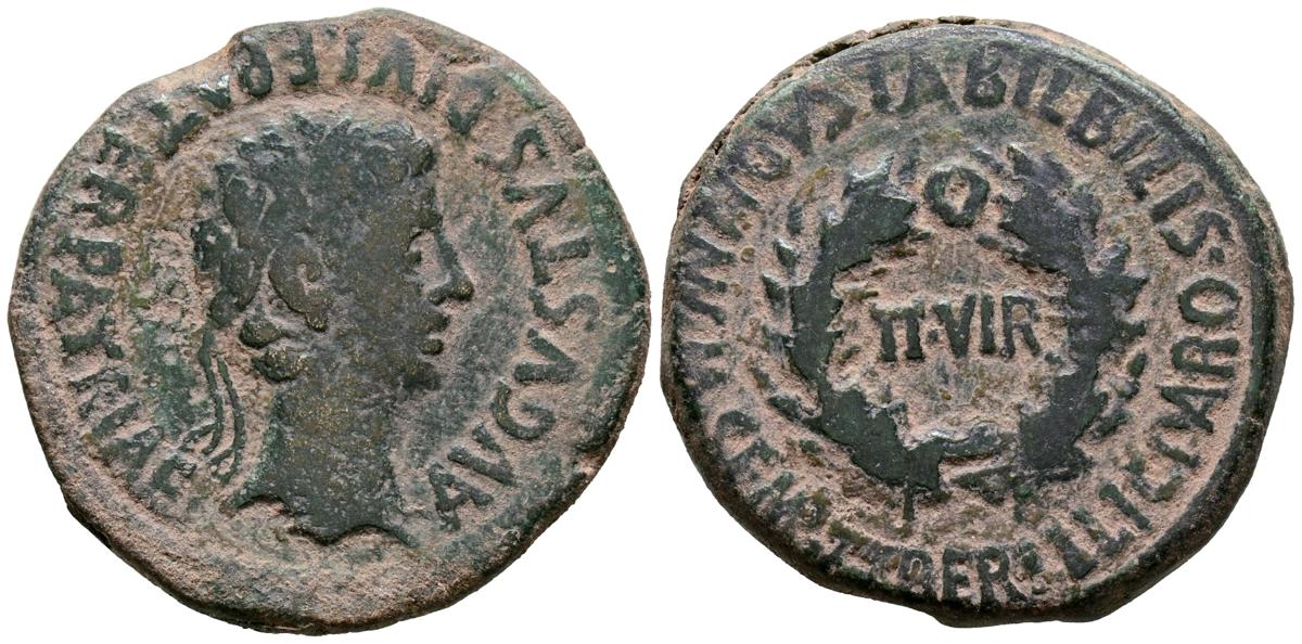 BILBILIS (Calatayud, Zaragoza). As. (Ae. 14,49g/28mm). 27 a.C.-14 d.C. (FAB-278). Anv: Cabeza laureada de Augusto a derecha, alrededor leyenda: AVGVSTVS DIVI F PATER PATRIAE. Rev: Corona de laurel, dentro: II VIR, alrededor leyenda: MVN AVGVSTA BILBILIS M SEMP TIBERI L LICI VARO. MBC.