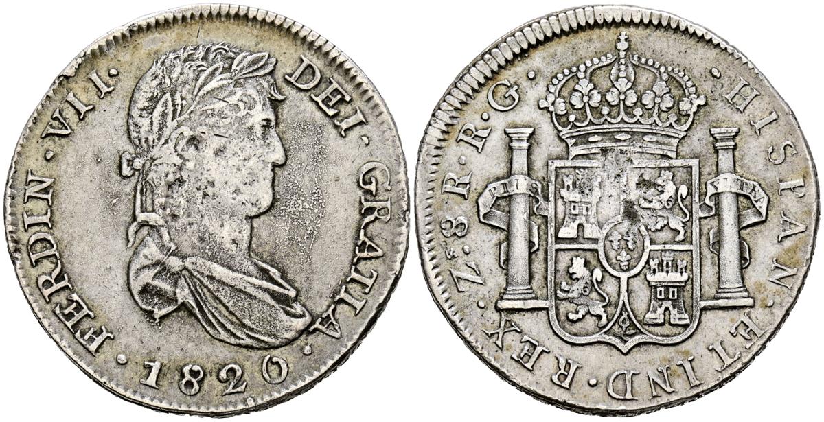 FERNANDO VII (1808-1833). 8 Reales. (Ar. 26,26g/39mm). 1820. Zacatecas RG. (Cal-2019-1464). MBC-. Oxidaciones.