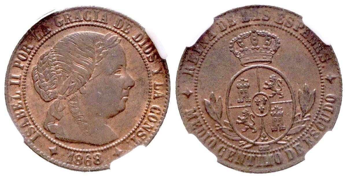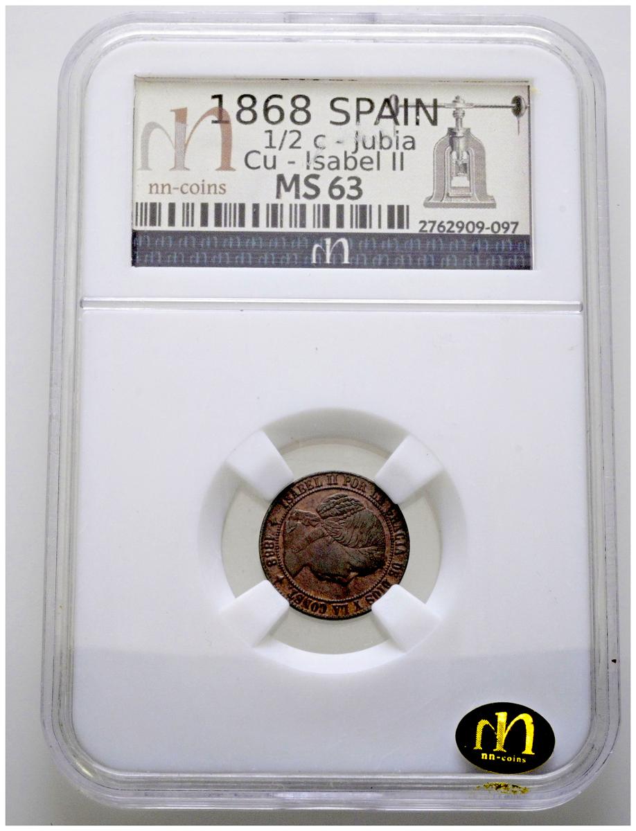 ISABEL II (1833-1868). 1/2 Céntimo de Escudo (Ae. 1,25g/16mm)*. 1868. Jubia OM. (Cal-2019-205). Encapsulado por NN Coins. MS 63. * Peso y medidas teóricos.