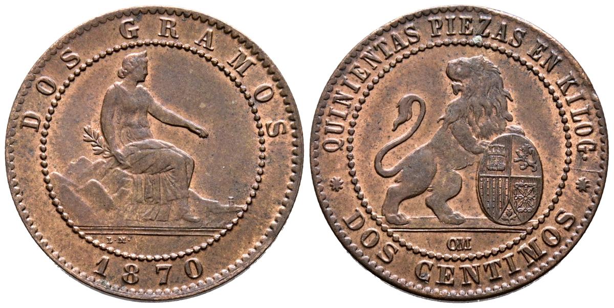 GOBIERNO PROVISIONAL (1868-1871). 2 Céntimos. (Ae. 2,07g/20mm). 1870. Barcelona. (Cal-2019-4). SC-. Bonito ejemplar.