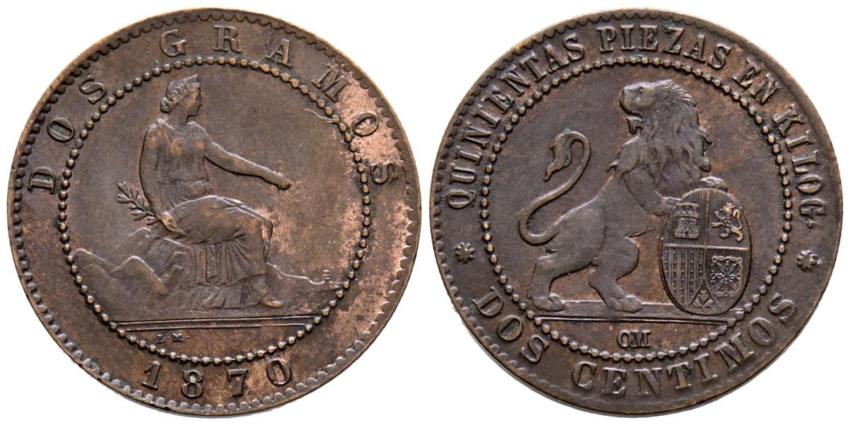 GOBIERNO PROVISIONAL (1868-1871). 2 Céntimos. (Ae. 1,91g/20mm). 1870. Barcelona. (Cal-2019-4). EBC-.
