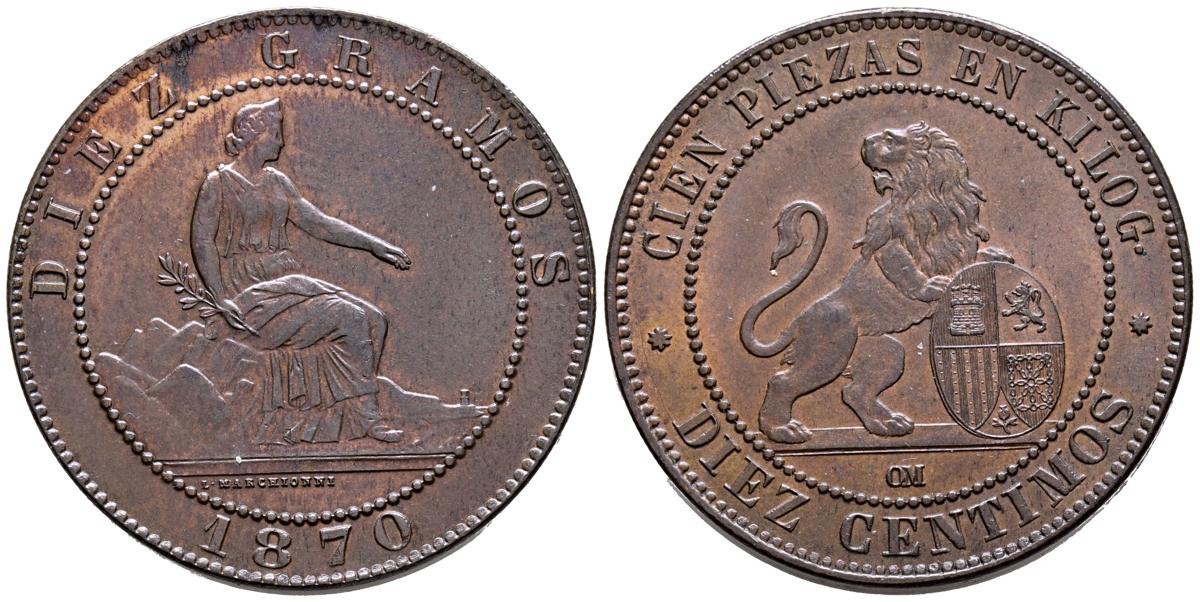 GOBIERNO PROVISIONAL (1868-1871). 10 Céntimos. (Ae. 9,73g/30mm). 1870. Barcelona. (Cal-2019-8). EBC+. Restos de brillo original. Escasa así.