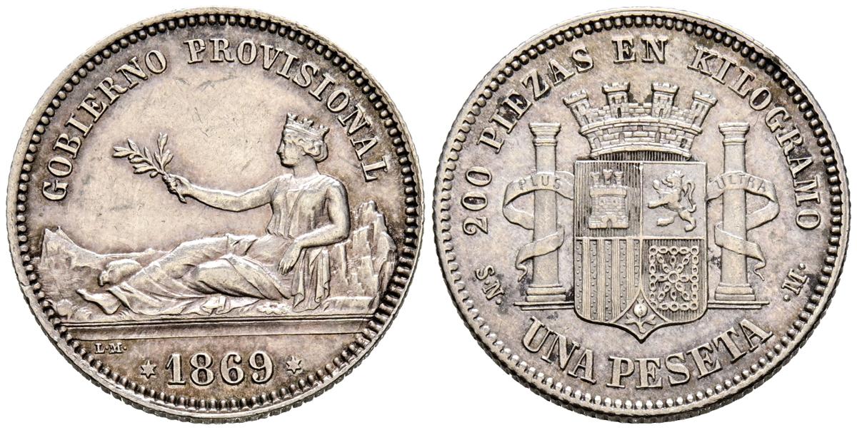 GOBIERNO PROVISIONAL (1868-1871). 1 Peseta. (Ar. 5,00g/23mm). 1869. Madrid SNM. (Cal-2019-16). Leyenda Gobierno Provisonal. EBC. Preciosa pátina. Rara así.