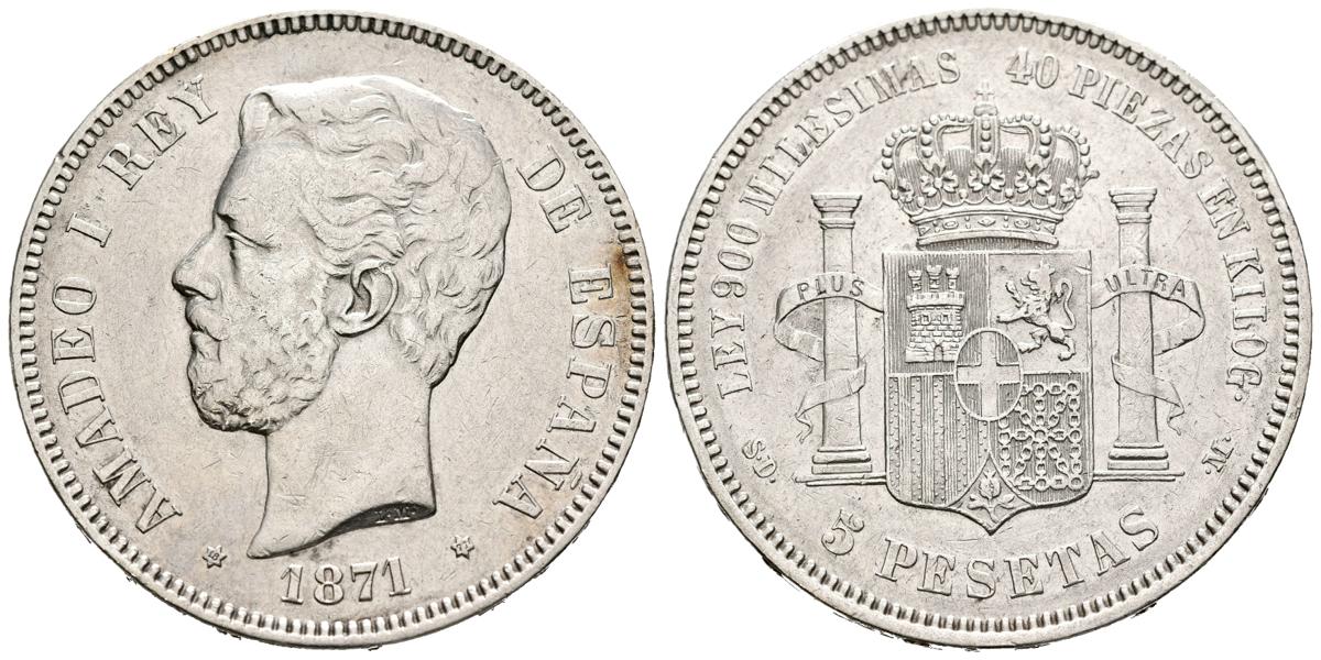 AMADEO I (1871-1873). 5 Pesetas. (Ar. 24,87g/37mm). 1871 *18-71. Madrid SDM. (Cal-2019-1). EBC-. Marquitas y rayitas de limpieza.
