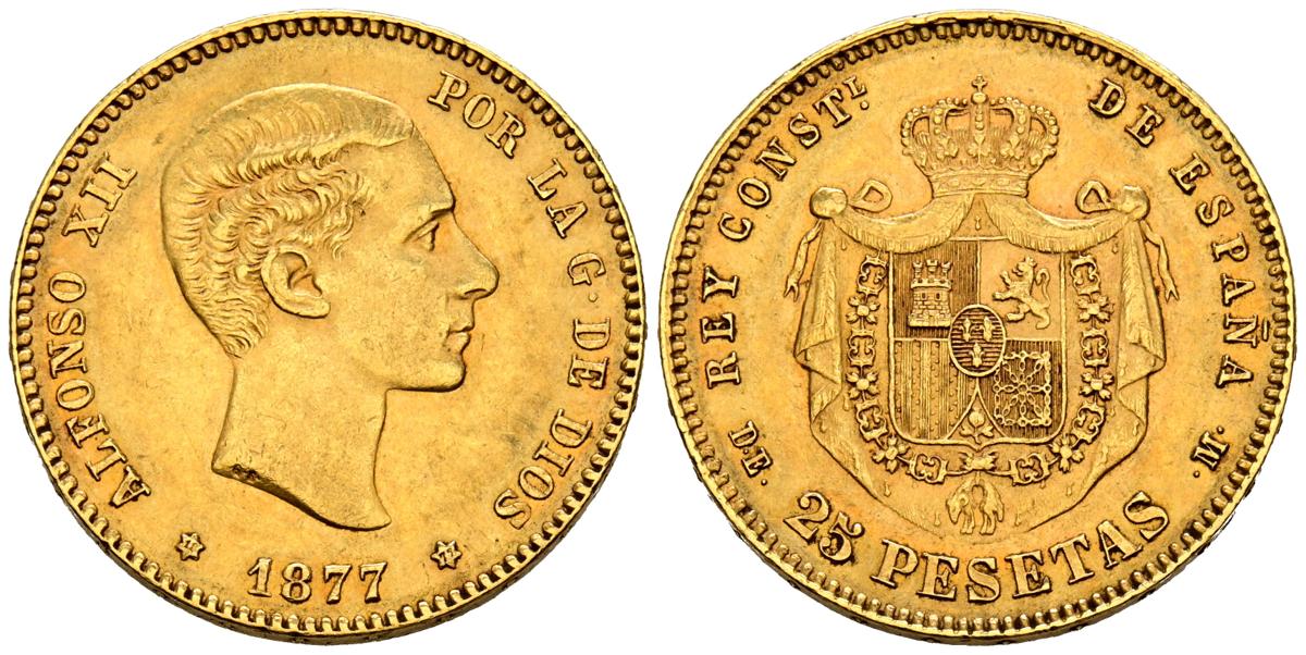 ALFONSO XII (1874-1885). 25 Pesetas. (Au. 8,06g/24mm). 1877 *18-77. Madrid DEM. (Cal-2019-68). MBC+.