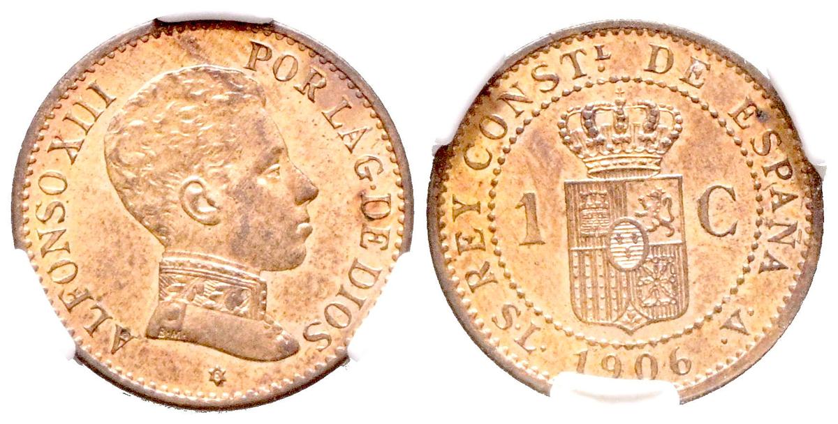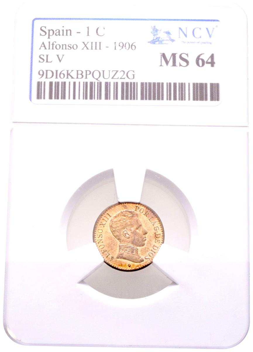 ALFONSO XIII (1885-1931). 1 Céntimo. (Ae. 1,00g/15mm)*. 1906 *6. Madrid SLV. (Cal-2019-2). Encapsulada por NCV. MS 64. *Peso y medidas teóricos.