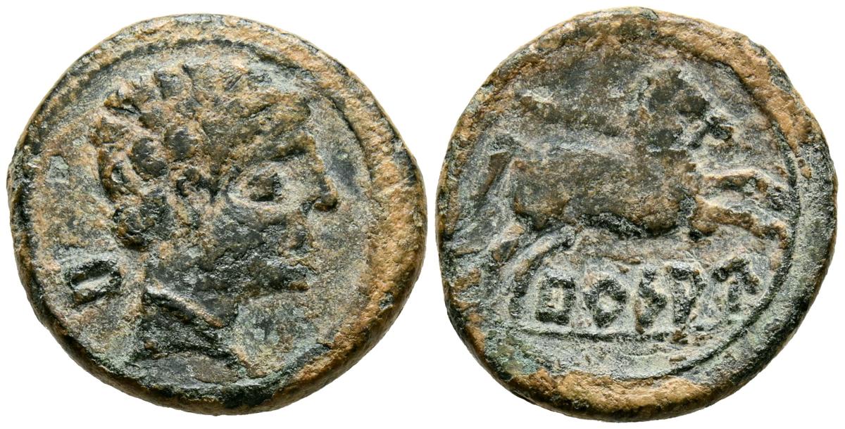 BURSAU (Borja, Zaragoza). Semis. (Ae. 5,84g/21mm). 120-80 a.C. (FAB-302). Anv: Cabeza masculina a derecha, detrás letra ibérica Bu. Rev: Caballo saltando a derecha con brida, debajo leyenda ibérica: BuRSAU. MBC-. Escaso ejemplar.