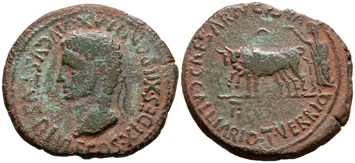 CAESARAUGUSTA (Zaragoza). As. (Ae. 11,98g/30mm). 27 a.C.-14 d.C. (FAB-326). Anv: Cabeza laureada de Augusto a izquierda, alrededor leyenda: AVGVSTVS DIVI F COS XI DES PON MAX. Rev: Yunta a izquierda, debajo: IIVIR, alrededor leyenda: CAESAR AVGVSTA C ALLIARIO T VERRIO. MBC-.