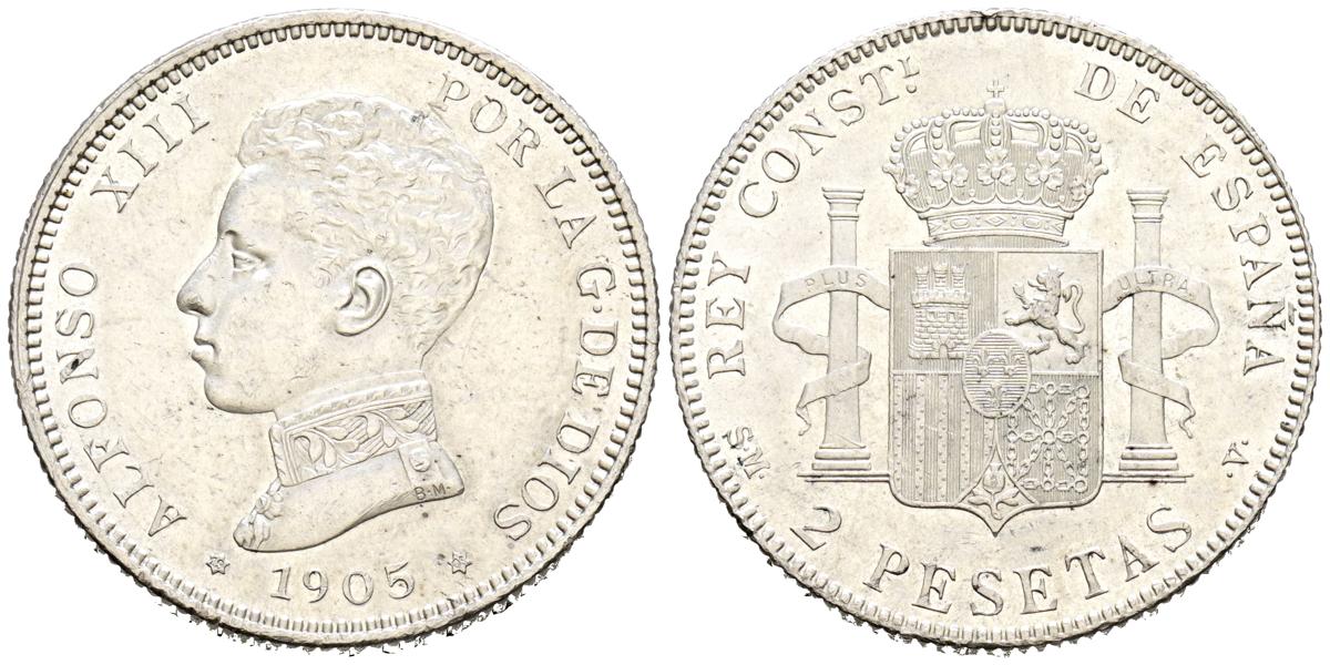 ALFONSO XIII (1885-1931). 2 Pesetas. (Ar. 10,01g/27mm). 1905 *19-05. Madrid SMV. (Cal-2019-88). EBC. Ligeras marquitas.