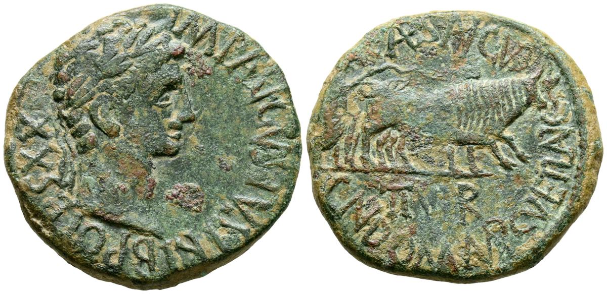 CAESARAUGUSTA (Zaragoza). As. (Ae. 11,30g/28mm). 27 a.C.-14 d.C. (FAB-327). Anv: Cabeza de Augusto laureada a derecha, alrededor leyenda: IMP AVGVSTVS TRIB POTES XX. Rev: Yunta a derecha, debajo: II VIR, alrededor leyenda: CAES AVGVS CN DOM AMP C VET LANC. MBC.