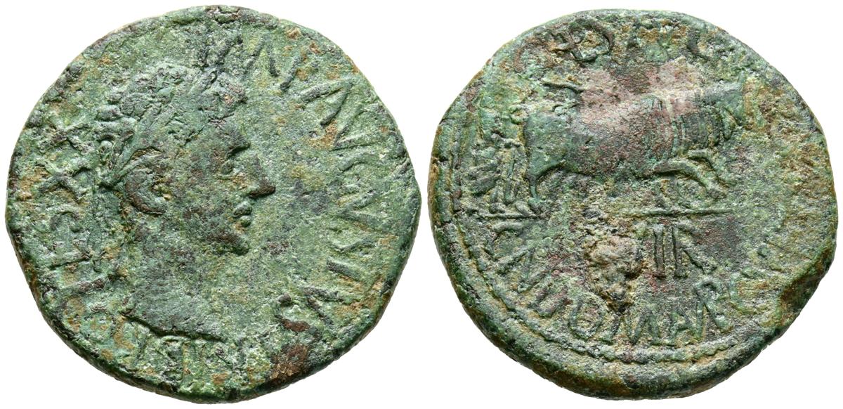 CAESARAUGUSTA (Zaragoza). As. (Ae. 11,10g/29mm). 27 a.C.-14 d.C. (FAB-327). Anv: Cabeza de Augusto laureada a derecha, alrededor leyenda: IMP AVGVSTVS TRIB POTES XX. Rev: Yunta a derecha, debajo: II VIR, alrededor leyenda: CAES AVGVS CN DOM AMP C VET LANC. MBC-.