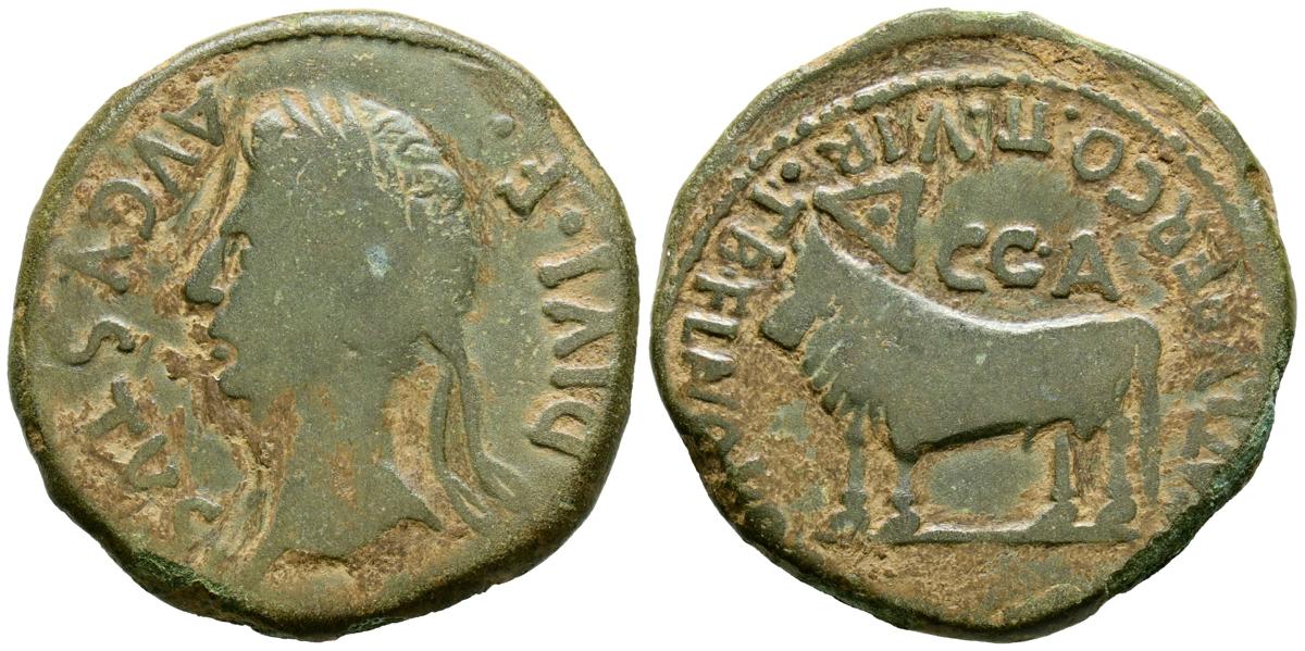 CAESARAGUSTA (Zaragoza). As. (Ae. 10,58g/28mm). 27 a.C.-14 d.C. (FAB-329). Anv: Cabeza laureada de Augsuto a izquierda, alrededor leyenda: DIVI F AVGVSTVS. Rev: Toro a izquierda, encima: CAA, alrededor leyenda: TIB FLAVO PRAEF GERMAN L IVENT LVPERLO II VIR. MBC-. Limpiado.