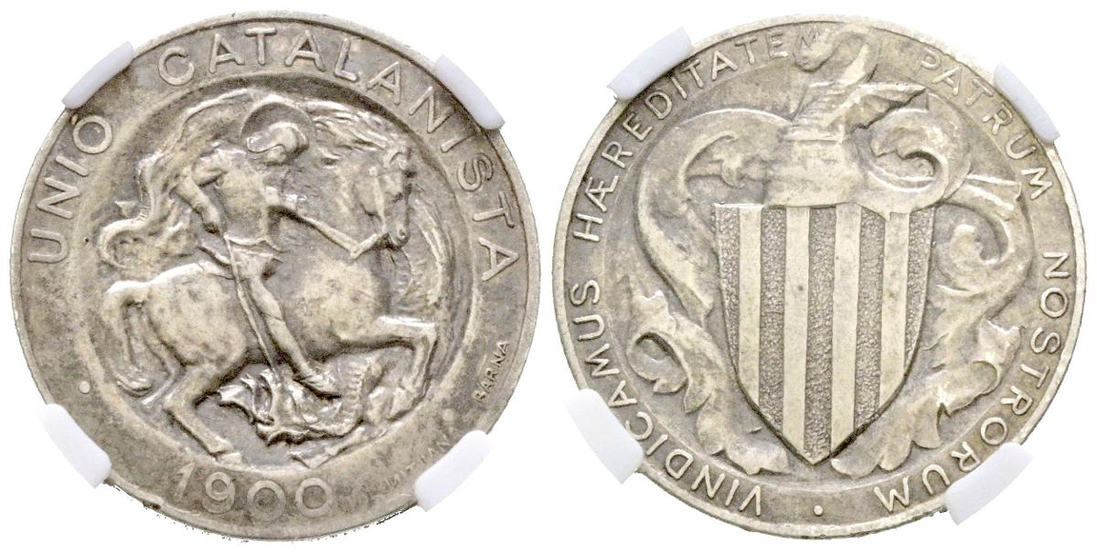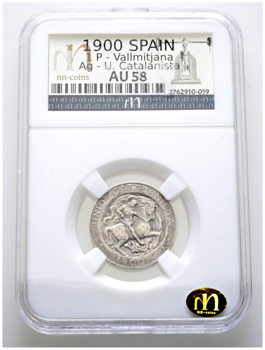 ALFONSO XIII (1885-1931). 1 Peseta. (Ar. 5,00g /23mm)*. 1900. Unión Catalanista. Talleres Vallmitjana. (Cal-2019-134). Encapsulada por NN Coins AU 58. * Peso y medidas teóricos.Las propuestas regionalistas catalanas tienen su origen en el descontento de ciertos sectores de la sociedad ante la Constitución de 1876. Todas estas corrientes consiguieron ser canalizadas en 1891 en la llamada Unión Catalanista, una amalgama de asociaciones y entidades, en ocasiones de ideología dispar, que nunca llegó a cristalizar en un partido político propiamente dicho aunque hicieran un intento algo tardío por presentarse a las elecciones de 1903, cuando ya eran un movimiento sin apenas eco en la política catalana. Aun así, no fue hasta el estallido de la Guerra Civil cuando se certificó su desaparición. Con el fin de recaudar fondos y también con cierto carácter conmemorativo, se tomó la decisión en el año 1900, de acuñar unas medallas de claras influencias modernistas que, dadas sus similitudes en módulo, metal y peso con las monedas contemporáneas terminaron siendo usadas como tales en pequeños círculos cercanos a estas asociaciones, adquiriendo desde estos momentos un sentido de moneda para el que realmente no fueron acuñadas.