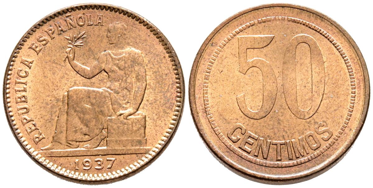 II REPÚBLICA (1931-1939). 50 Céntimos (Ae. 5,95g/23mm). 1937. (Cal-2019-28). Orla de cuadraditos. Variante sin estrellas en anverso. EBC+.
