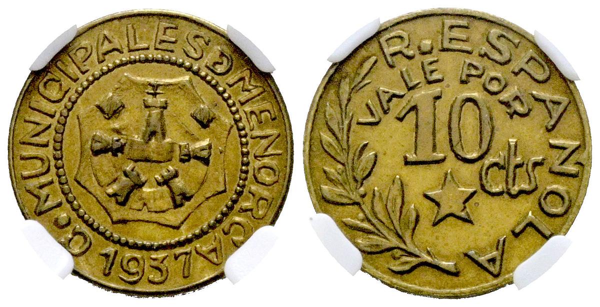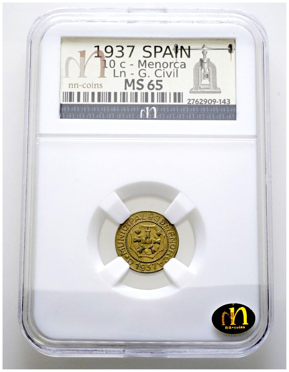 MENORCA. 10 Céntimos. (Ln. 2,30g/17mm)*. 1937. (Cal-2019-21). Encapsulada por NN Coins MS 65.*Peso y medida teóricos.